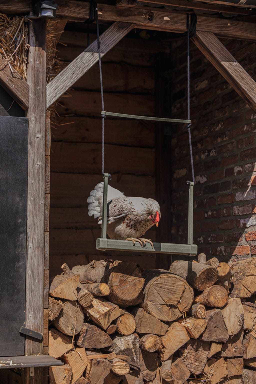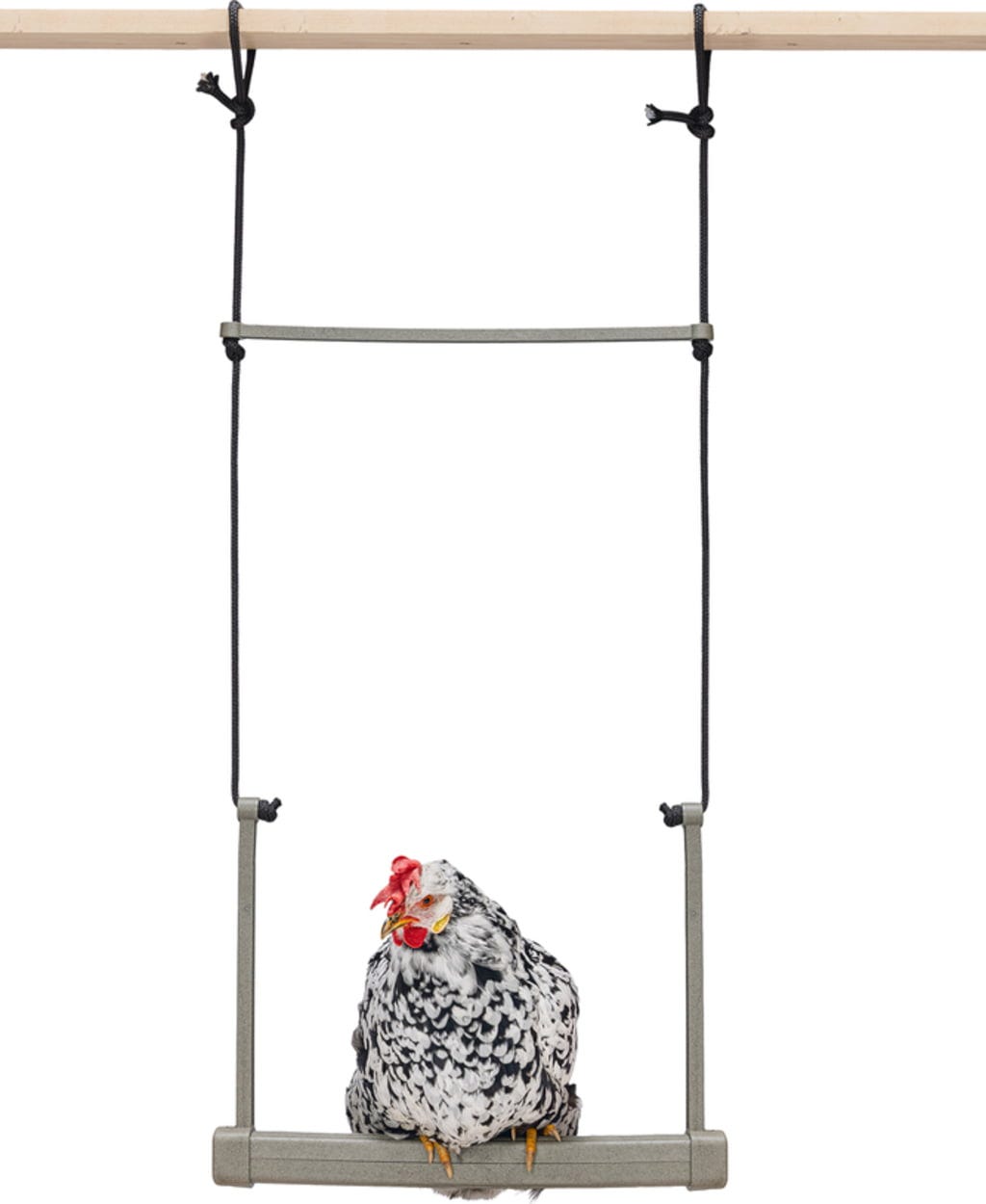 Materiál: hojdačka je nielen zábavnou aktivitou pre sliepky, ale je aj šetrná k životnému prostrediu. Je vyrobená zo 100 % recyklovaného plastu, ktorý pochádza z cca 42 nápojových kartónov. Lanká sú tiež vyrobené z recyklovaných PET fliaš.