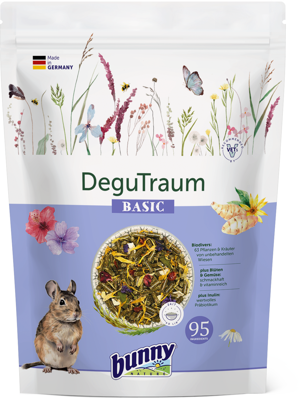Keď sa degu splnia sny... toto chutné jedlo určite nie je ďaleko! Vďaka 63 rôznym rastlinám z neošetrených lúk, ako aj vybraným rastlinám z pôvodnej vlasti degu a cennému inulínu poskytuje chutnú rozmanitosť v miske s krmivom a umožňuje kvalitnú, druhovo vhodnú stravu pre vašich chlpatých priateľov.