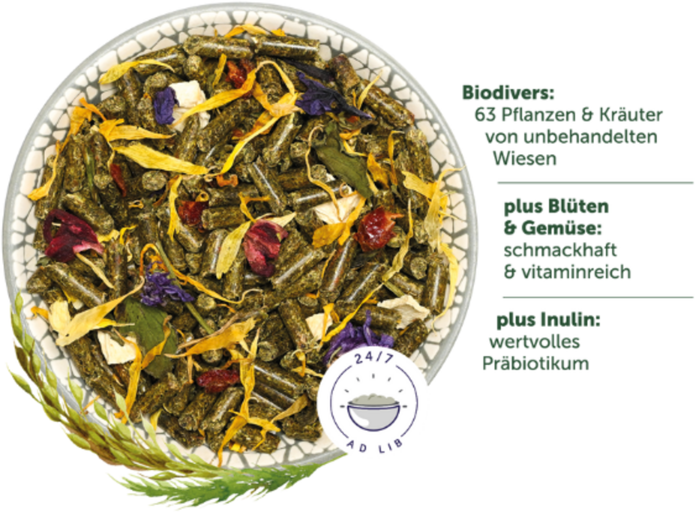 Porast z trvalého trávnika (Timothy, Kostrava lúčna, Kostrava červená, Psiarka lúčna, Lipnica lúčna, Reznačka laločnatá, Trebuľka lesná, Púpavec srsnatý, Hrachor lúčny, Rebríček obyčajný, Alchemilka, Tomka voňavá, Ďatelinka poľná, Skorocel, Šalvia lúčna, Kraslica prostredná, Stoklas vzpriamený, Zvonček konáristý, Rasca lúčna, Nevädza lúčna, Rožec, Pichliač roľný, Bromus hordeaceus, Púpava, Metlica trsnatá, Tužobník brestový, Rožec roľný, Lesná jahoda, Vika vtáčia, Veronika obyčajná, Škarda dvojročná, Lipkavec, Helictotrichon pubescens, Ľadenec, Praslička roľná, Biely lipkavec, Biely pakost, Kopretina irkutská, Chrastavec roľný, Kukučka lúčna, Vrbica vŕbolistá, Veronika poľná, Ovsík, Lipnica lúčna, Skorocel prostredný, Krvavec lekársky, Vika, Nezábudka roľná, Lomikameň zrnitý, Bedrovník lomikameňový, Nátržník plazivý, Prvosienka jarná, Silenka ovisnutá, Krvavec menší, Hviezdica trávovitá, Kozobrada lúčna, Žihľava dvojdomá, Veronika dúškolistá, Ďatelina červená, Vika plotná, Zbehovec Ženevský, Kozonoha hostcová, Sedmokráska), Celá kukurica, Timothy, Slnečnicová múka, Pšeničné otruby, Ľanový šrot, Lupina celá rastlina, Otruby z ovsených šupiek, Repkový extrahovaný šrot, Pivovarské mláto, Lignocellulose, Pastinák, Pivovarské kvasnice inaktivované a sušené, Pšeničné klíčky, Zemiakový proteín, Ľanové semienka, Kvety nechtíka lekárskeho, Paprika, Paradajka, Stonky petržlenu, Lístky mäty piepornej, Listy topinamburu, Kvety ibišteka, 0,6 % Chicoree Inulin, Amarant, Kvety slezu, Lístky skorocelu, Púpava, Koreň maca, Semeno feniklu, Pestrec mariánsky, Kvety harmančeka, Šalvia (4 % Zelenina, 2 % Kvety)