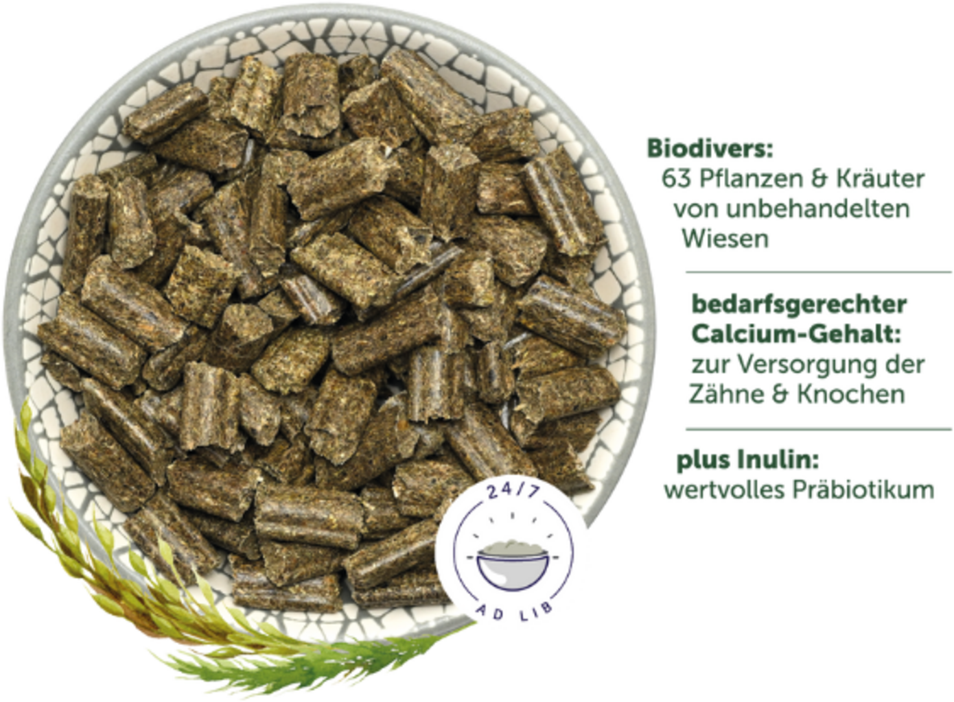 Porast z trvalého trávnika (Timothy, Kostrava lúčna, Kostrava červená, Psiarka lúčna, Lipnica lúčna, Reznačka laločnatá, Trebuľka lesná, Púpavec srsnatý, Hrachor lúčny, Rebríček obyčajný, Alchemilka, Tomka voňavá, Ďatelinka poľná, Skorocel, Šalvia lúčna, Kraslica prostredná, Stoklas vzpriamený, Zvonček konáristý, Rasca lúčna, Nevädza lúčna, Rožec, Pichliač roľný, Bromus hordeaceus, Púpava, Metlica trsnatá, Tužobník brestový, Rožec roľný, Lesná jahoda, Vika vtáčia, Veronika obyčajná, Škarda dvojročná, Lipkavec, Helictotrichon pubescens, Ľadenec, Praslička roľná, Biely lipkavec, Biely pakost, Kopretina irkutská, Chrastavec roľný, Kukučka lúčna, Vrbica vŕbolistá, Veronika poľná, Ovsík, Lipnica lúčna, Skorocel prostredný, Krvavec lekársky, Vika, Nezábudka roľná, Lomikameň zrnitý, Bedrovník lomikameňový, Nátržník plazivý, Prvosienka jarná, Silenka ovisnutá, Krvavec menší, Hviezdica trávovitá, Kozobrada lúčna, Žihľava dvojdomá, Veronika dúškolistá, Ďatelina červená, Vika plotná, Zbehovec Ženevský, Kozonoha hostcová, Sedmokráska), Otruby z ovsených šupiek, Slnečnicová múka, Ľanový šrot, Jablkové výlisky, Mrkvové výlisky, Pšeničné otruby, Repkový extrahovaný šrot, 0,6 % Chicoree Inulin, Bylina harmančeka