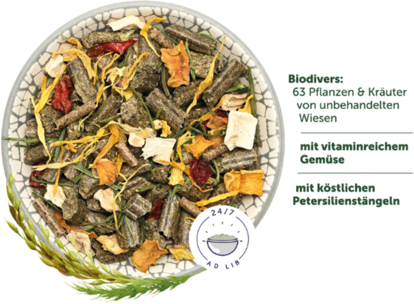 Keď sa splnia králičie sny... toto chutné jedlo určite nie je ďaleko! Vďaka 63 rôznym rastlinám z neošetrených lúk a množstvu zeleniny bohatej na vitamíny poskytuje chutnú rozmanitosť v miske s krmivom a zabezpečuje kvalitnú, druhovo vhodnú stravu pre vašich chlpatých priateľov.