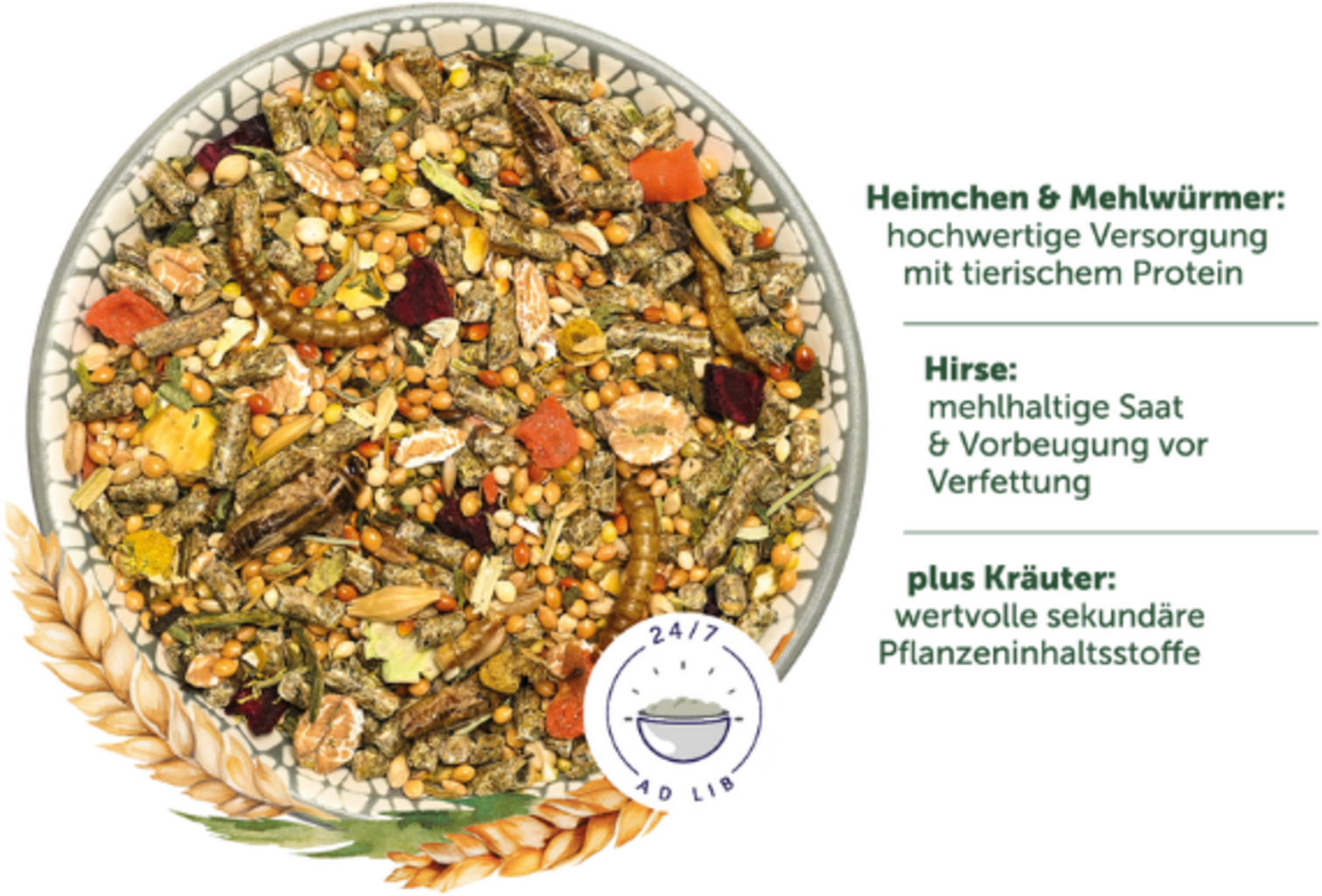 Proso Plata, Ovos, Jačmeň, Hrachové vločky, Pšeničné otruby, Vločky špaldy, Proso siate, Slnečnicová múka, Pšenica, Kukurica, Drvená kukurica, Červené proso, Semeno dari, Lucerne meal, Lucerna, Púpava, Lesknica kanárska, Slnečnicové semienka, Calcium carbonate, Pivovarské mláto, Kamut, Mrkvové výlisky, Ľanové semienka, Mrkvy, Pastinák, Korene čakanky, Ovsené zrná, Pivovarské kvasnice inaktivované a sušené, Harmanček, Lístky skorocelu, Chicoree Inulin, Sezamové semienka, Zemiakový proteín, Červená repa, 0,3 % Cvrčky, Rohovník, 0,2 % Múčne červy (23 % Proso, 4 % Bylinky)