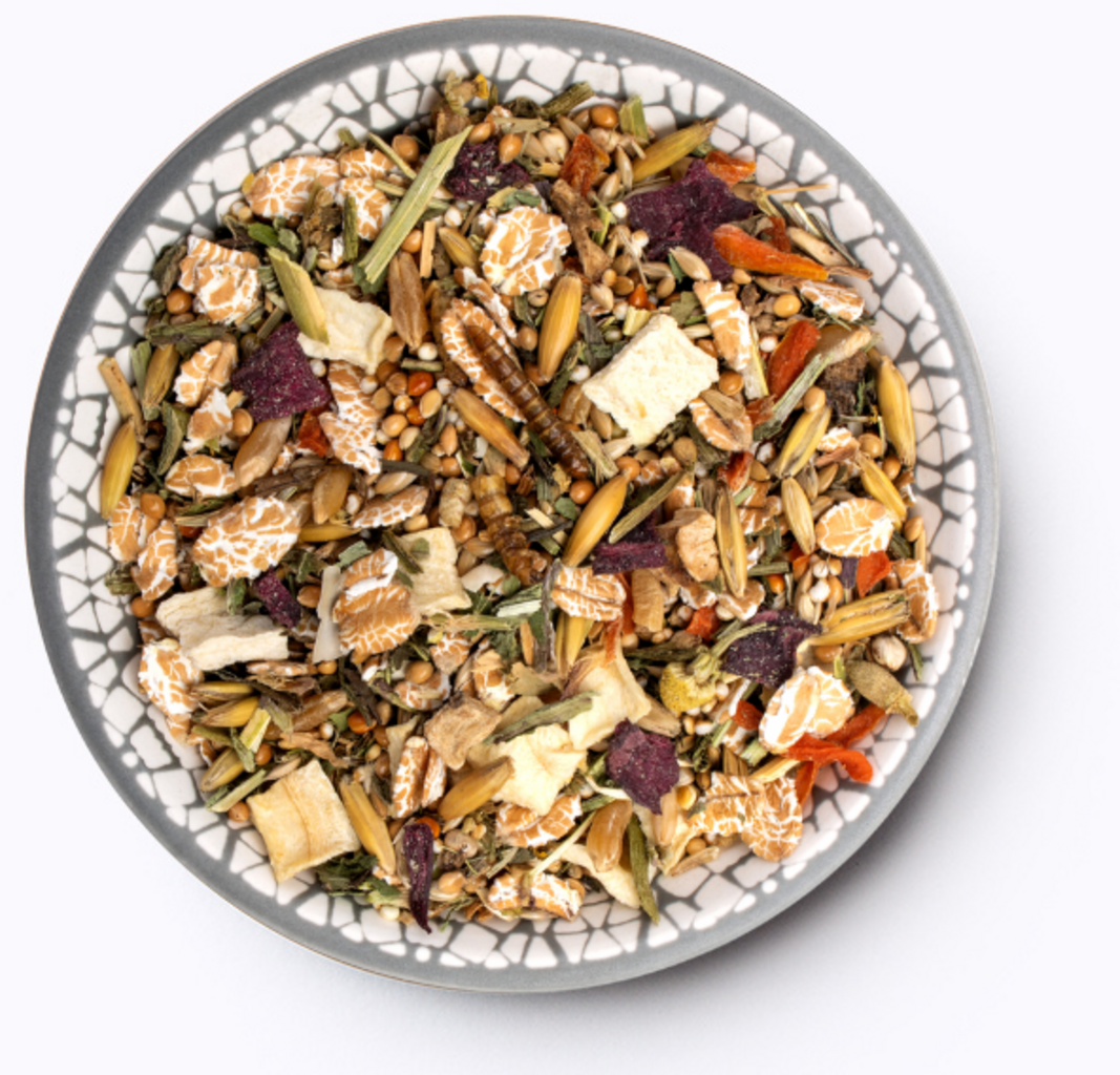 Proso Plata, Lesknica kanárska, Hrachové vločky, Vločky špaldy, Semená quinoy, Kamut, Mungo fazule, Proso siate, Ovos, Červené proso, Dari, Lucerna, 3 % Púpavové listy, Pufovaný amarant, Mrkvy, Pastinák, Korene čakanky, Sezam, 1 % Skorocel, Ovsené zrná, Calcium carbonate, Červená repa, 1 % Múčne červy, Harmanček, 0,2 % Cvrčky, Pšeničné otruby (54,6 % Semená)
