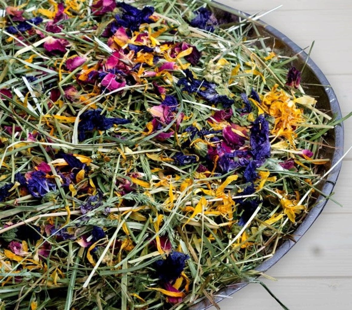 Seno, Kvety slezu, Kvety nechtíka lekárskeho, Kvety ruží, Kvety harmančeka (1,5 % Kvety)