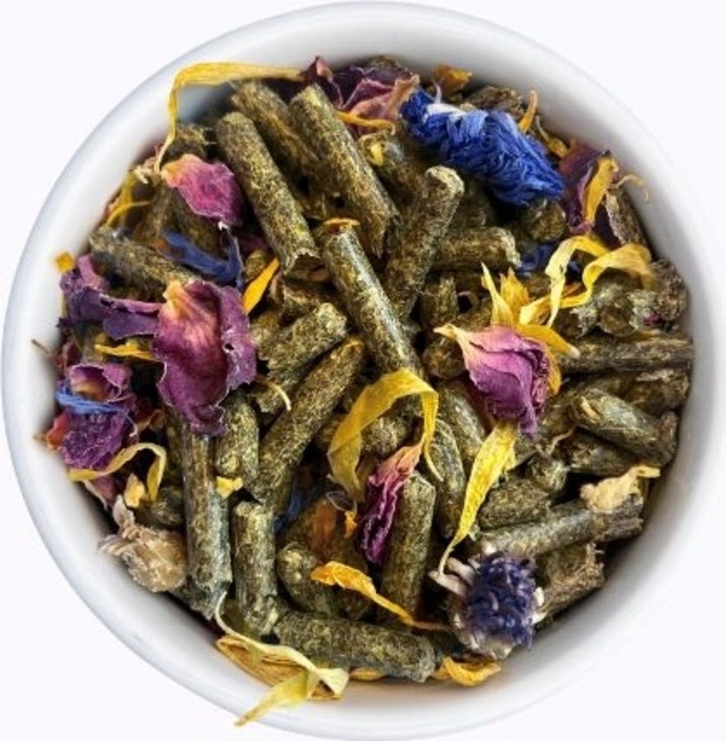 41 % Timothy, Otruby z ovsených šupiek, Slnečnicová múka, Porast z trvalého trávnika, Ľanový šrot, Mrkvové výlisky, Repkový extrahovaný šrot, Ľanové semienka, Okvetné lístky ruží, Modré nevädzové kvety, 1,5 % Listy brezy, Inulín, Okvetné lístky nechtíka lekárskeho, 0,75 % Koreň ihlice, 0,75 % Lístky žihľavy, Celobióza, Tymián, Koreň petržlenu, Ligurček, Borievka, Čierne ríbezle