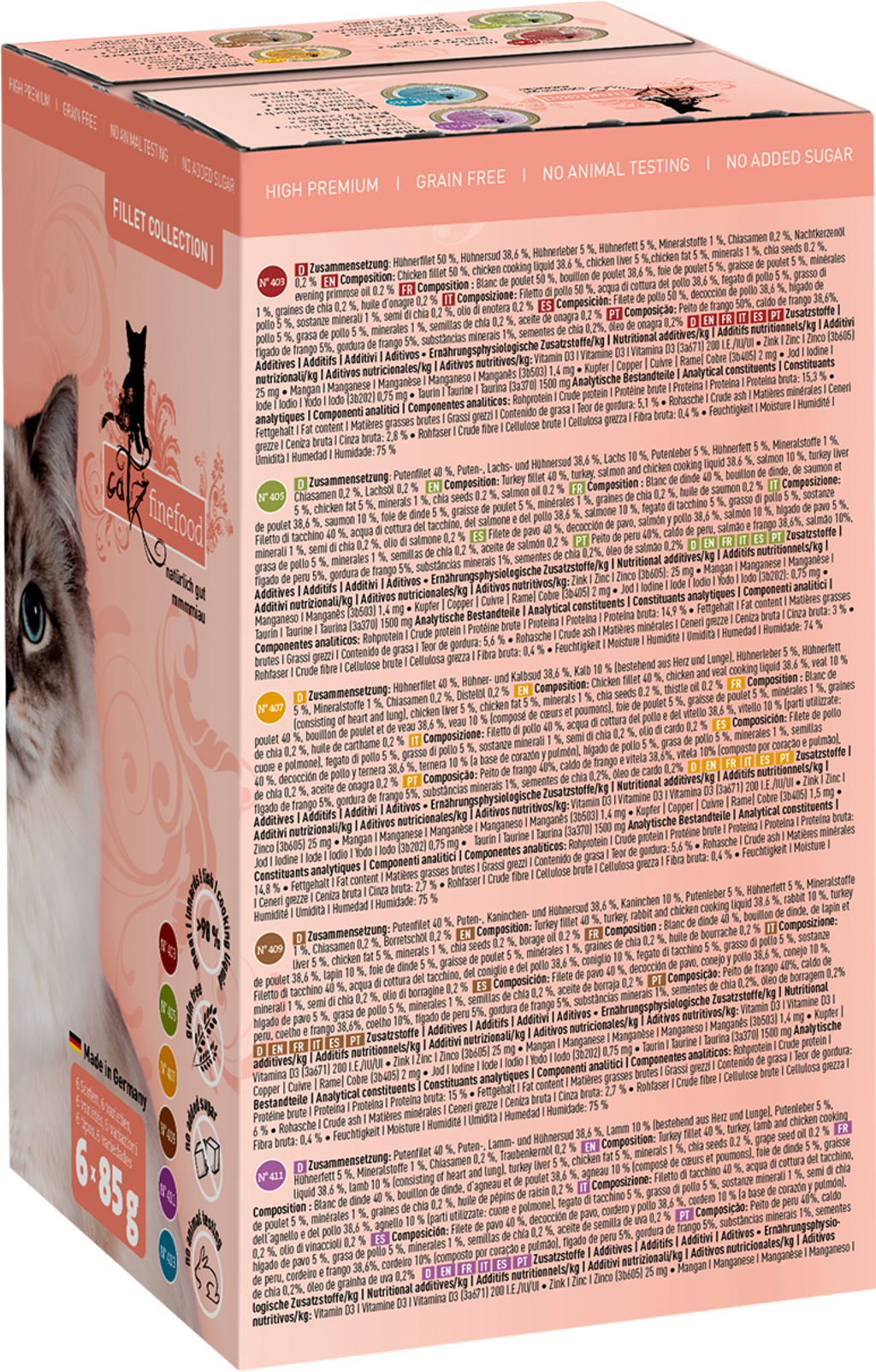 Toto vynikajúce mokré krmivo rozpradie aj tie najrozmaznanejšie mačky, pretože tu dostávajú tie najlepšie kúsky mäsa s jemnými filetami ako základnou zložkou. Táto druhovo vhodne zostavená pochúťka, doplnená o vnútornosti, minerálne látky, vybrané oleje a chia semienka, nadchne aj skutočných gurmánov, ktorí sa uspokojia len s tým najlepším.