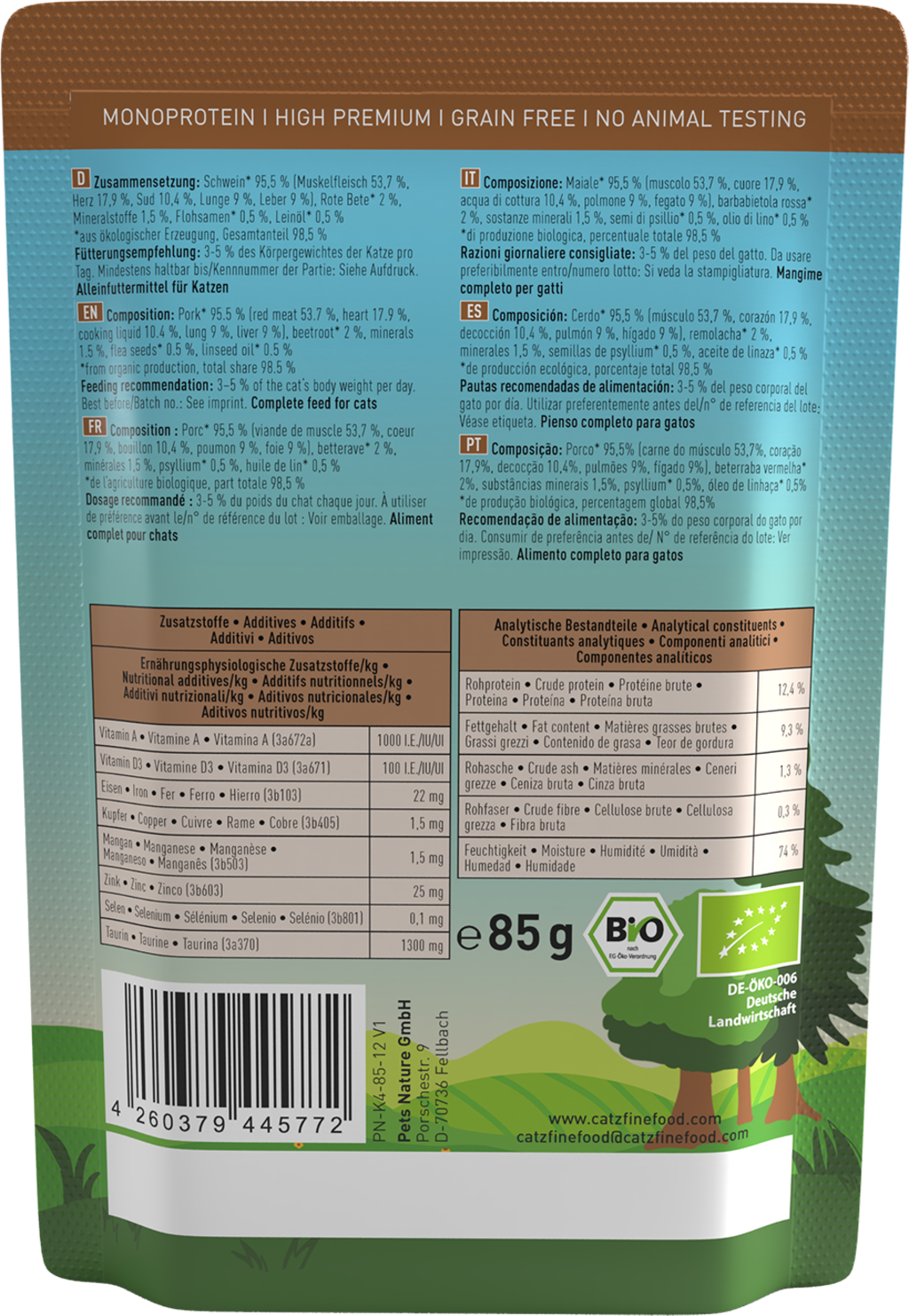 Toto vysokokvalitné monoproteínové mokré krmivo v bio kvalite ponúka mačke prirodzený a druhovo vhodný pôžitok. Vybrané bio ingrediencie a špeciálna receptúra podľa konceptu „koristi“ dodávajú vašej mačke všetko, čo potrebuje, a prispievajú tak k základnej časti vitálneho života mačky.