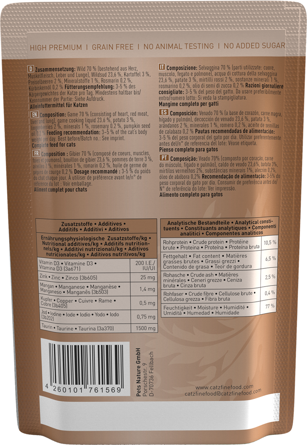 S týmto prémiovým mokrým krmivom môžete vašej mačke dopriať niečo výnimočné a rozmaznávať ju vybranými prírodnými ingredienciami v špičkovej kvalite a s vynikajúcou chuťou. Zloženie podľa konceptu „koristi“ rešpektuje prirodzenosť vašej mačky a prináša jej tak kúsok pôvodnej kvality života.