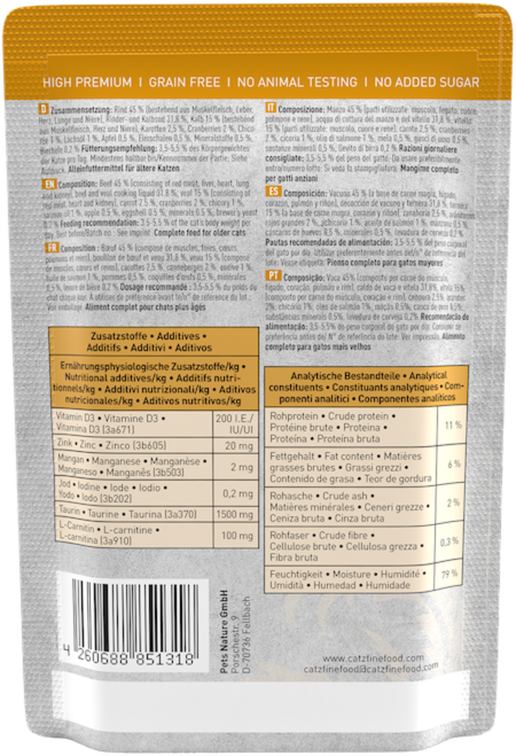 | Vlastnosti produktu: | bez GMO, bez zvýrazňovačov chuti, bez kostnej a mäsovej múčky, bez konzervačných látok, bez umelých farbív, bez umelých farbív a atraktantov, bez umelých aróm, bez pridaného cukru, bez obilnín, bez testovania na zvieratách |