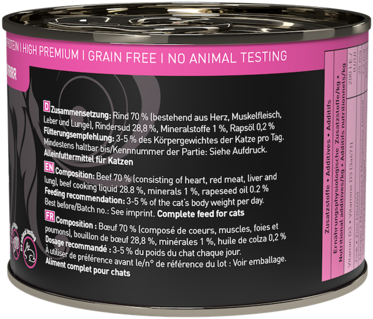 70 % Hovädzie mäso (Srdce, Svalovina, Pečeň, Pľúca), 28,8 % Hovädzí vývar, 1 % Minerálne látky, 0,2 % Repkový olej