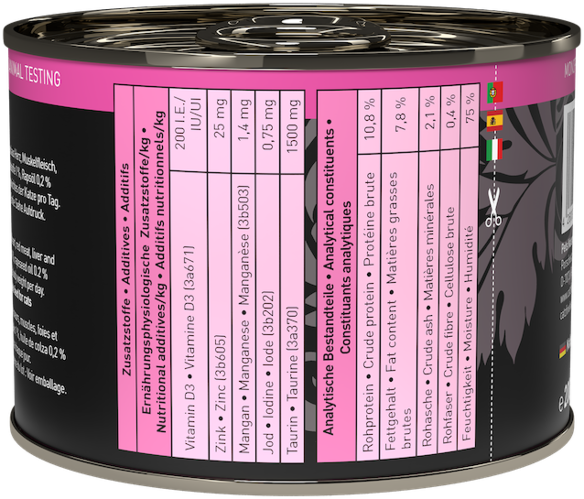 Chutné prémiové mokré krmivo zaručene rozpradie vašu mačku! Vybrané ingrediencie, receptúra zodpovedajúca prirodzeným potrebám podľa konceptu „koristi“ a úplne bez zbytočných prísad - to je čistý pôžitok pre vašu mačku a vynikajúci základ pre jej vitálny život.
