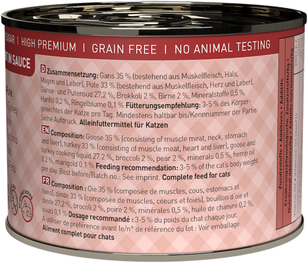 35 % Hus (Svalovina, Krk, Žalúdok, Pečeň), 33 % Morka (Svalovina, Srdce, Pečeň), Husací vývar, 27,2 % Vývar z morčacieho mäsa, 2 % Brokolica, 2 % Hruška, 0,5 % Minerálne látky, 0,2 % Konopný olej, 0,1 % Nechtík lekársky