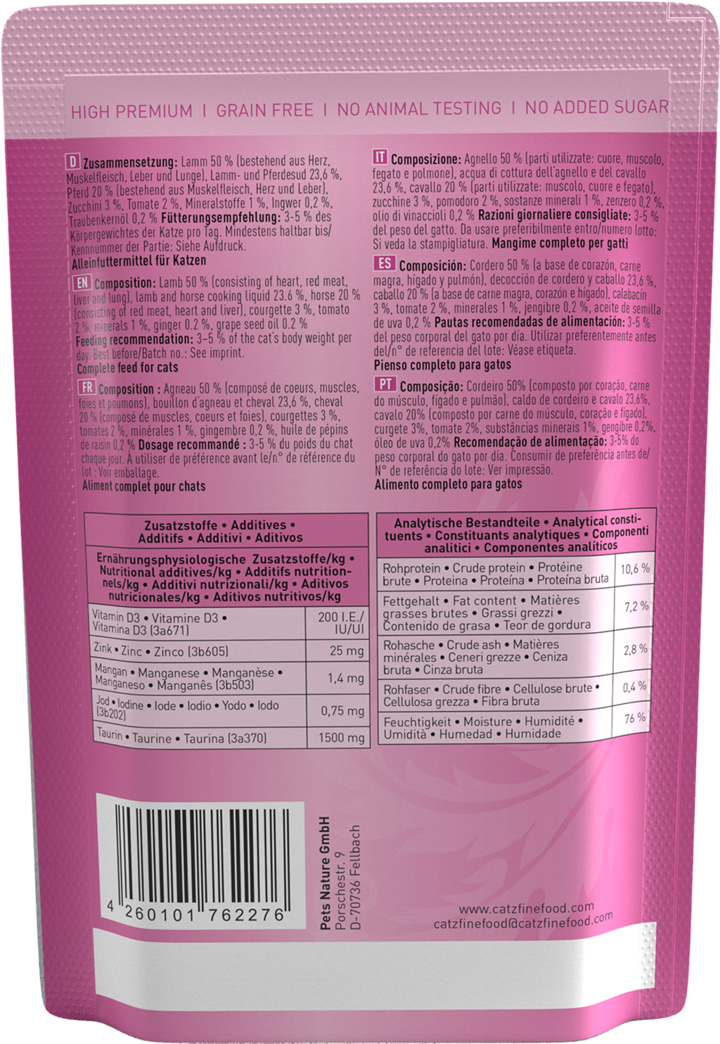 50 % Jahňa (Srdce, Svalovina, Pečeň, Pľúca), 23,6 % Jahňací a konský vývar, 20 % Kôň (Svalovina, Srdce, Pečeň), 3 % Cuketa, 2 % Paradajka, 1 % Minerálne látky, 0,2 % Zázvor, 0,2 % Olej z hroznových jadierok