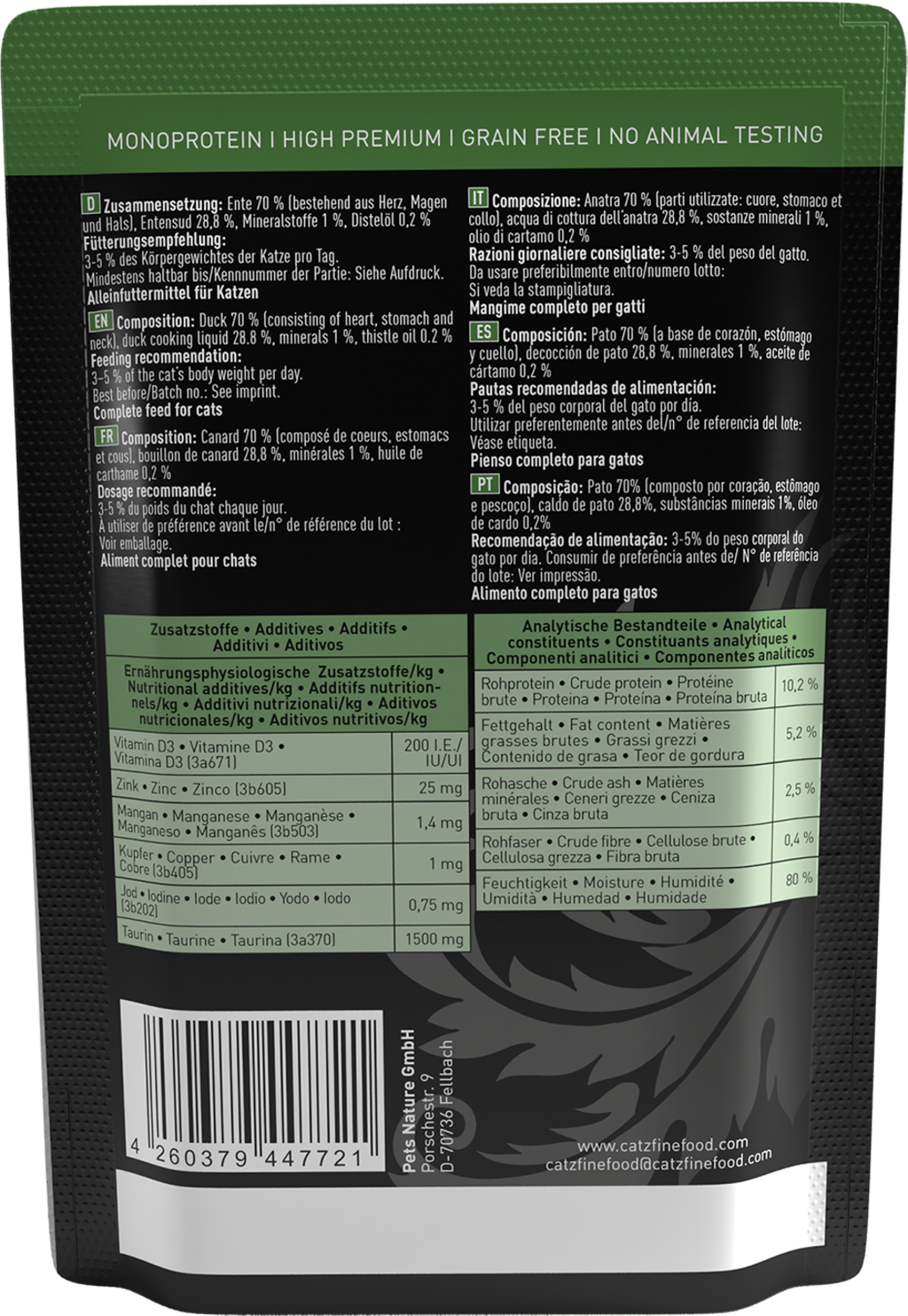 | Vlastnosti produktu: | bez GMO, bez zvýrazňovačov chuti, bez kostnej a mäsovej múčky, bez konzervačných látok, bez umelých farbív, bez umelých farbív a atraktantov, bez umelých aróm, bez pridaného cukru, bez obilnín, bez lepku, monoproteínový, bez sóje, bez testovania na zvieratách |