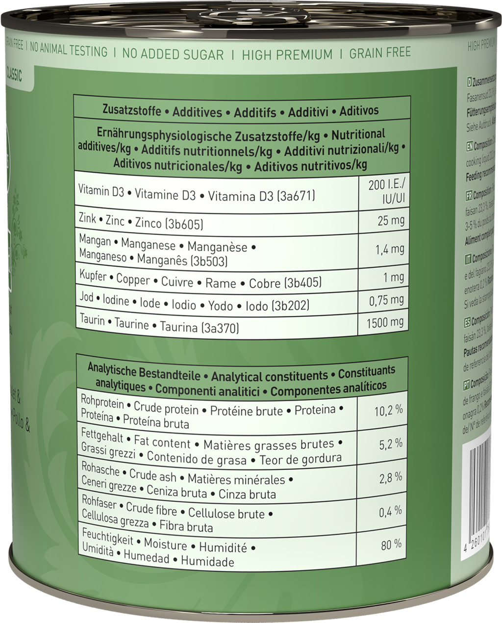50 % Kura (Srdce, Svalovina, Pečeň, Žalúdok, Krk, Tuk), 23,3 % Kurací a bažantí vývar, 20 % Bažant, 3 % Quinoa, 2 % Žerucha, 1 % Minerálne látky, 0,5 % Púpavové listy, 0,2 % Pupalkový olej