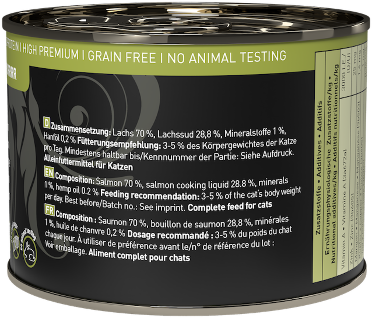 70 % Losos, 28,8 % Lososový vývar, 1 % Minerálne látky, 0,2 % Konopný olej