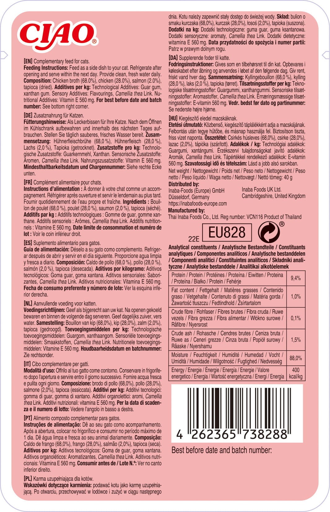 68 % Kurací vývar, 28 % Kuracie mäso, 2 % Losos, Sušená tapioka, Guarová guma, Xanthan, Arómy