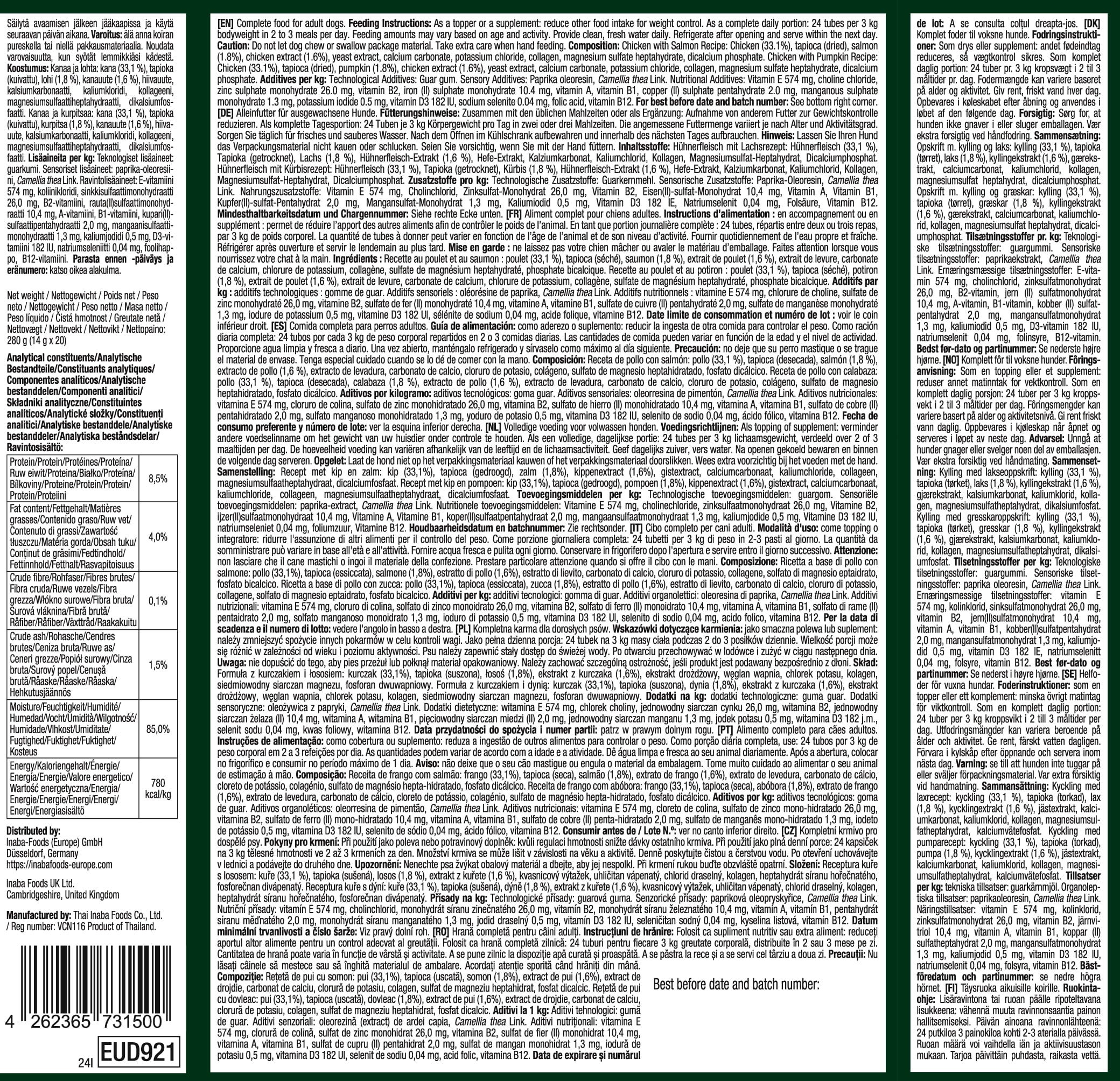 33,1 % Kuracie mäso, Sušená tapioka, 1,8 % Losos, 1,6 % Kuracie mäso, Výťažok z kvasníc, Calcium carbonate, Potassium chloride, Kolagén, Magnesium sulfate heptahydrate, Dicalcium phosphate