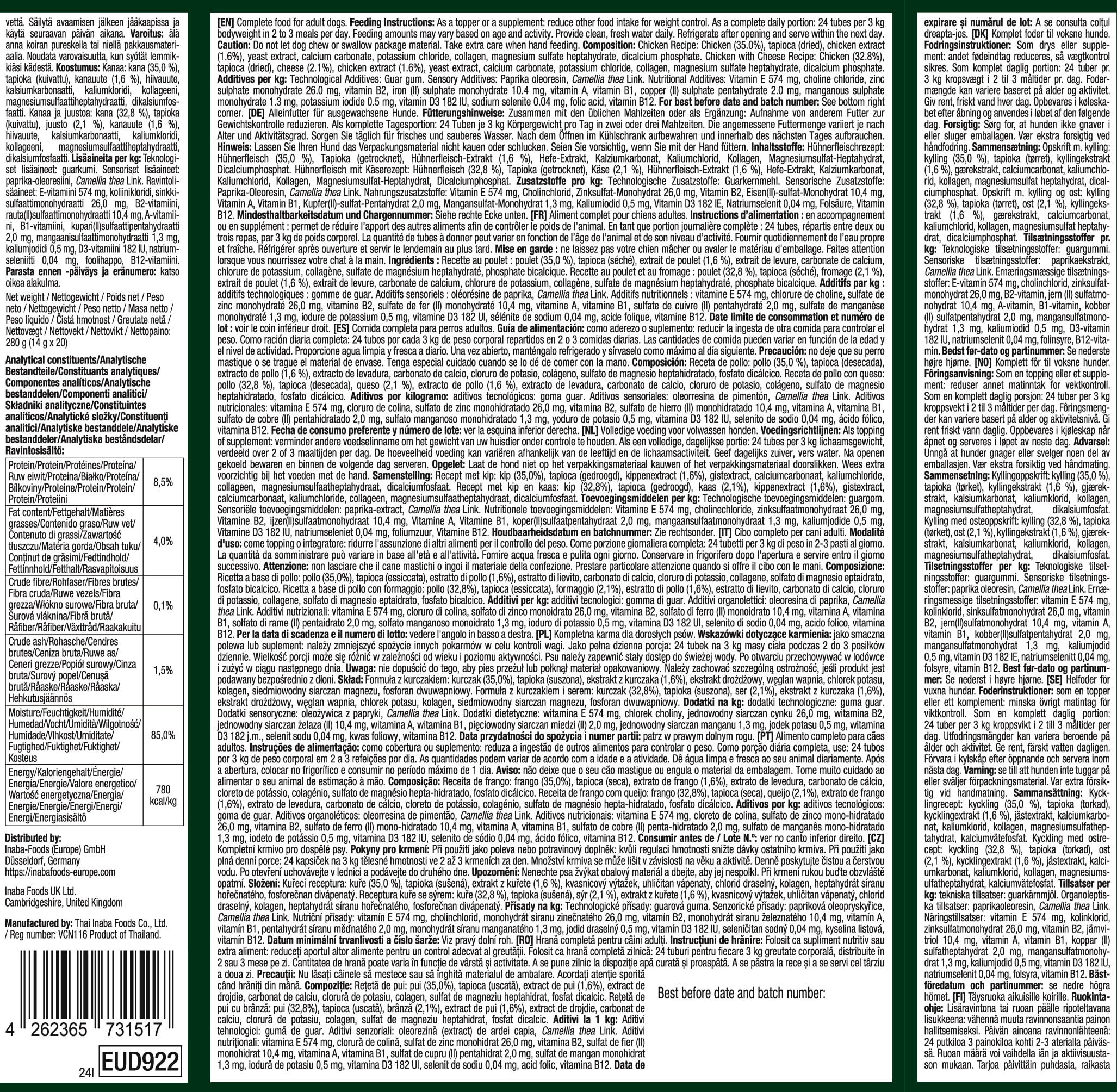 35 % Kuracie mäso, Sušená tapioka, 1,6 % Kuracie mäso[1], Výťažok z kvasníc, Calcium carbonate, Potassium chloride, Kolagén, Magnesium sulfate heptahydrate, Dicalcium phosphate