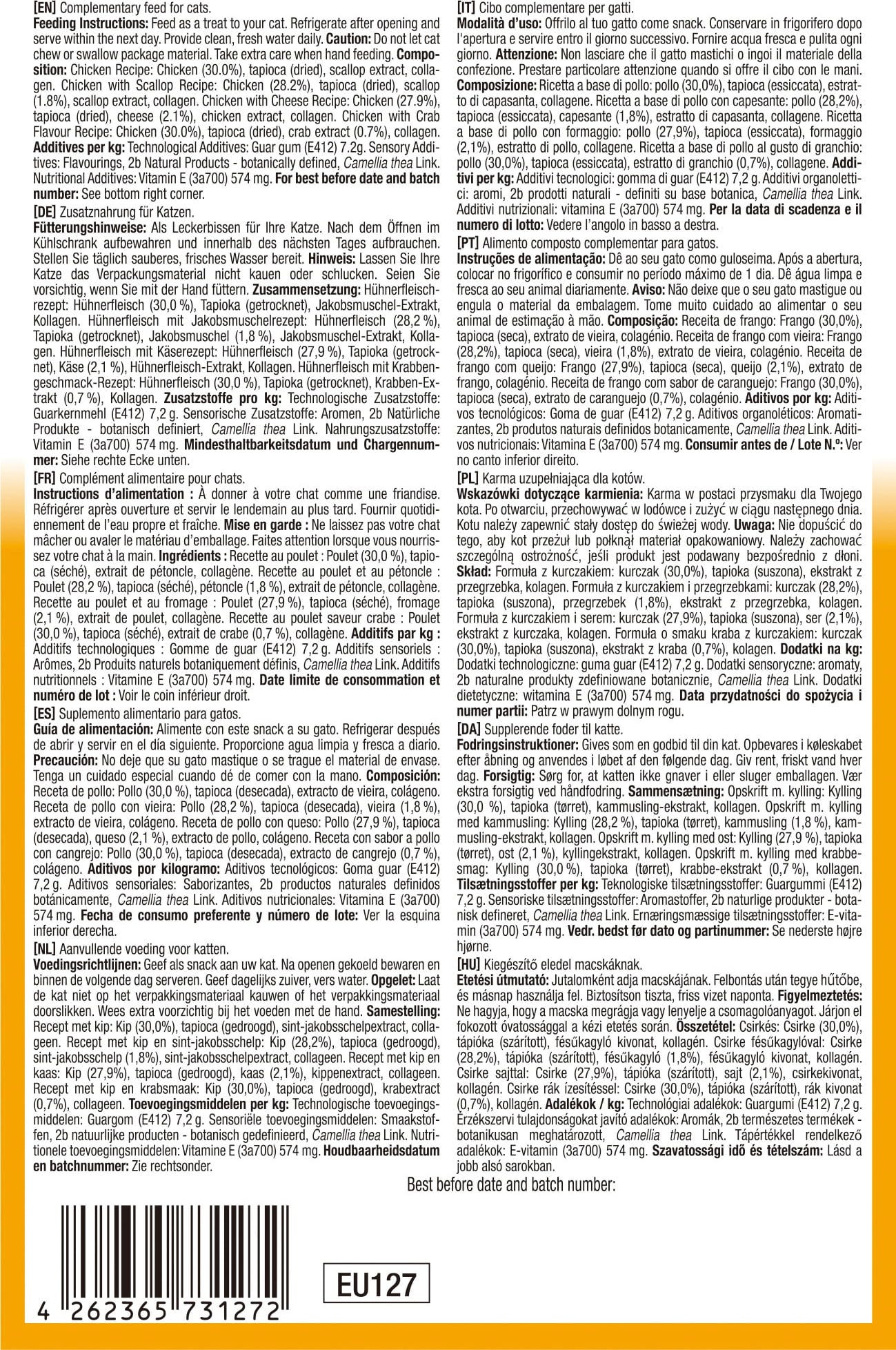30 % Kuracie mäso, Tapioka, 0,7 % Krabí extrakt, Kolagén, Extrakt zo zeleného čaju