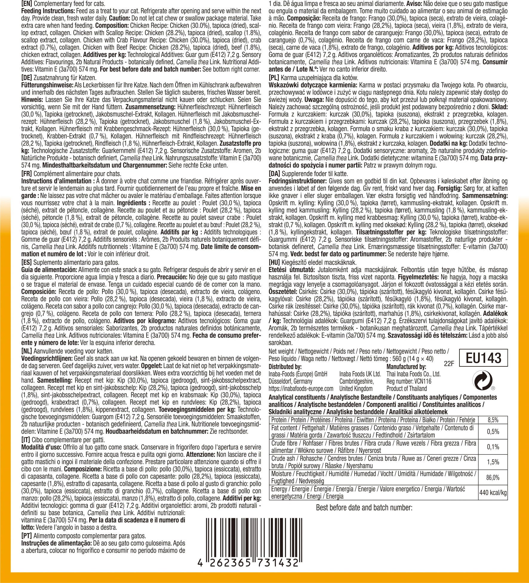 30 % Kuracie mäso, Tapioka, 0,7 % Krabí extrakt, Kolagén, Extrakt zo zeleného čaju