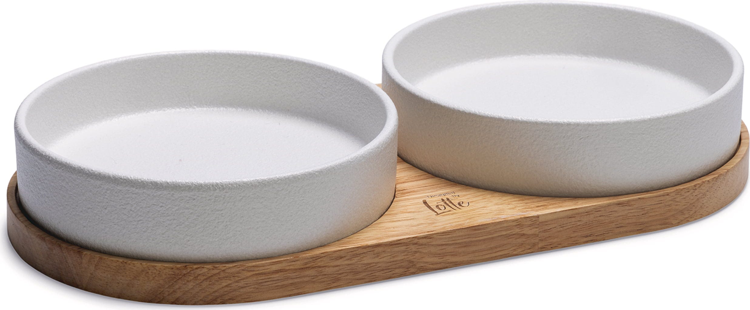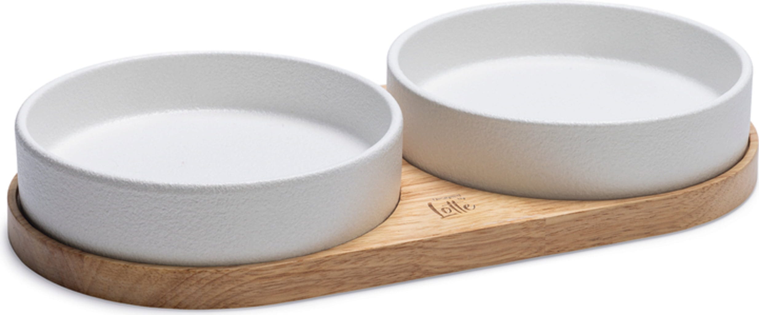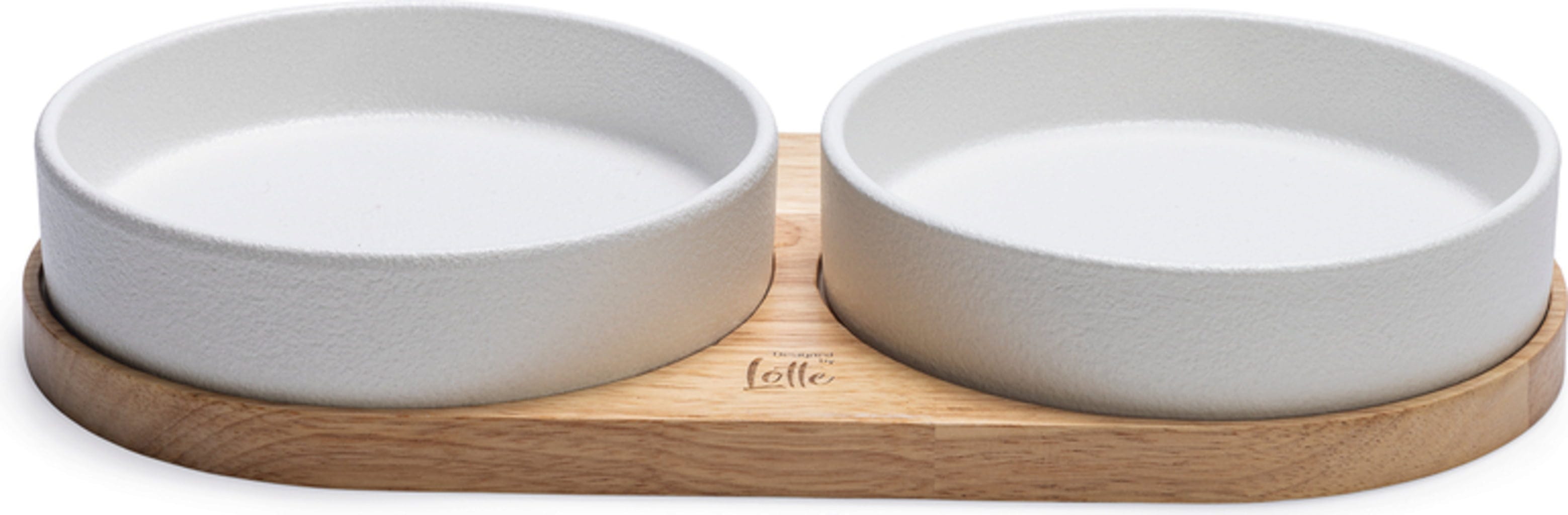 • Elegantná sada pre mačky pozostávajúca z drevenej podložky a 2 keramických misiek