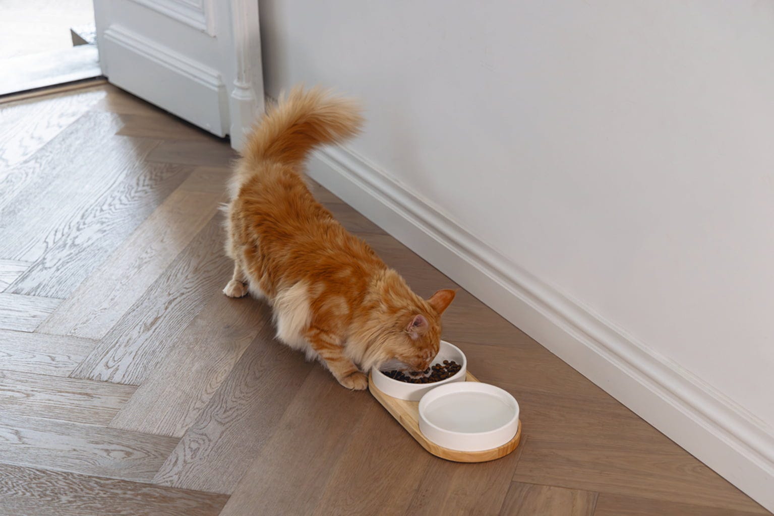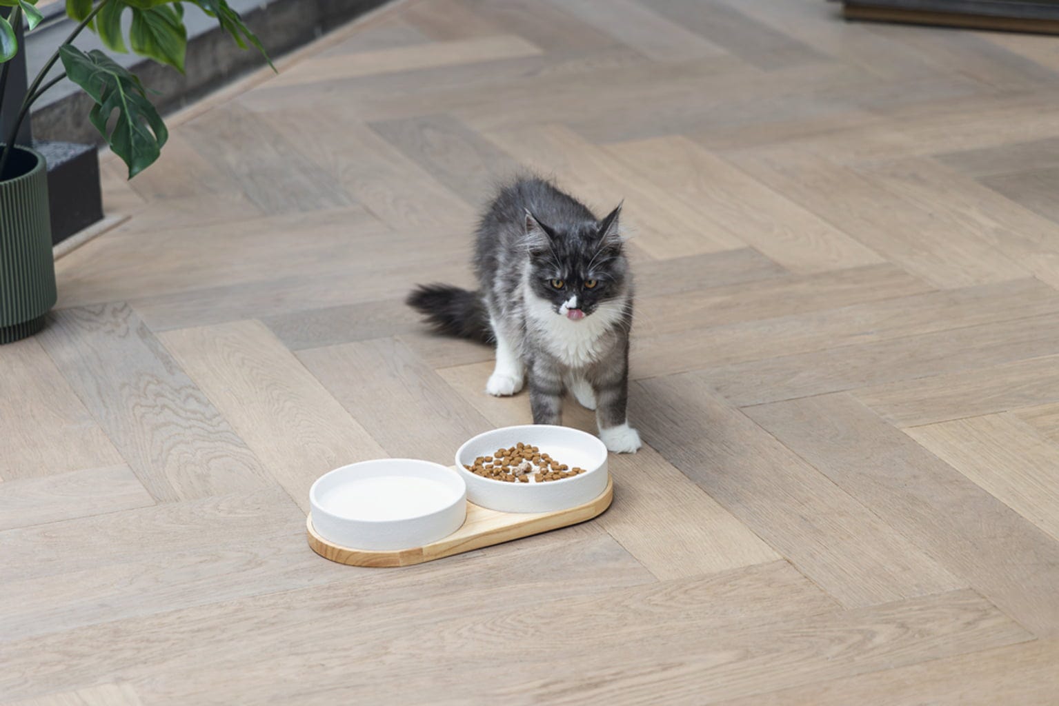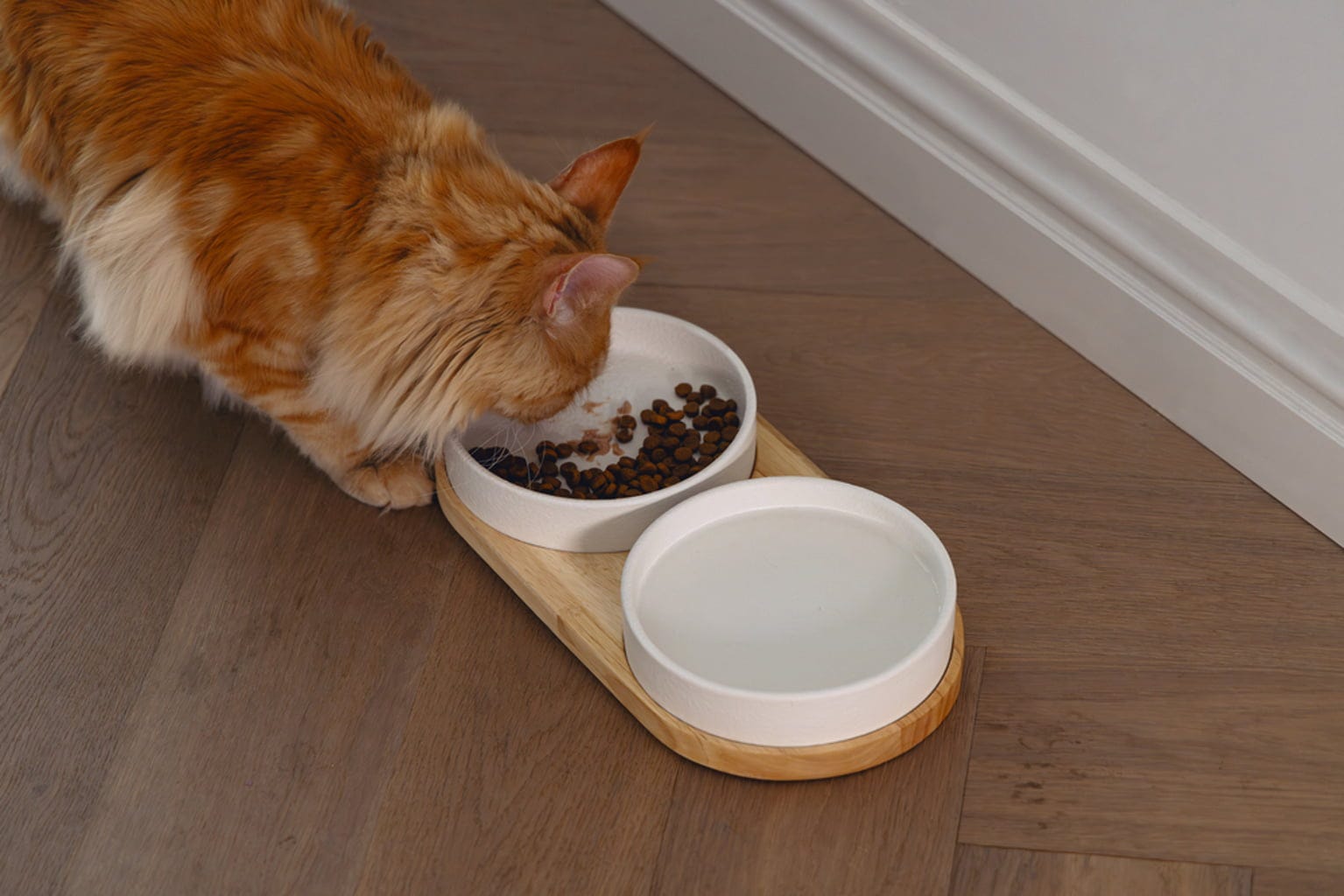 • Elegantná sada pre mačky pozostávajúca z drevenej podložky a 2 keramických misiek