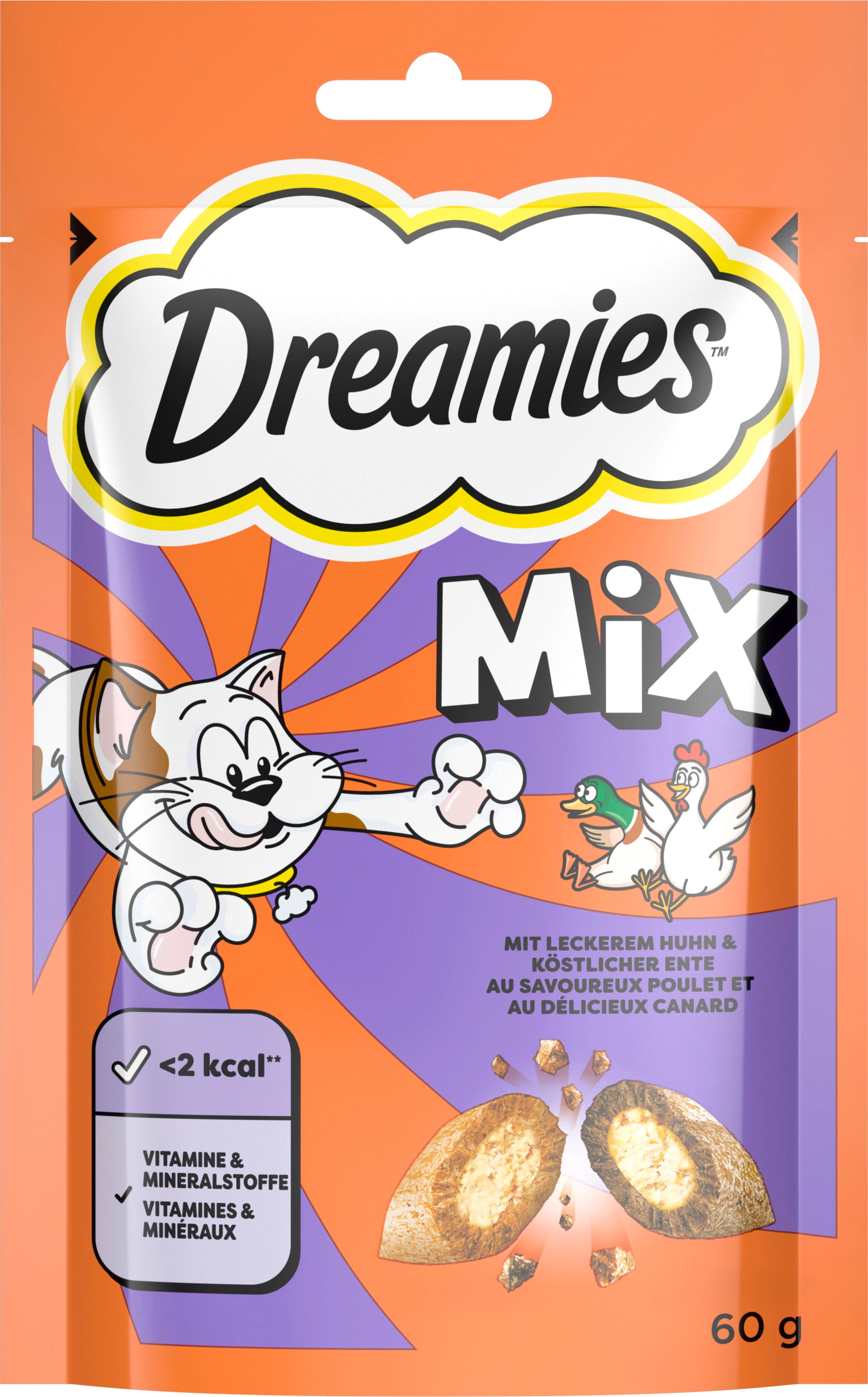 S produktom Dreamies Mix s kuracím a kačacím mäsom prekvapíte vašu mačku hneď dvoma chutnými druhmi obľúbenej pochúťky. Chrumkavý pečený obal ukrýva neodolateľný krém. Receptúra vyniká starostlivo vybranými ingredienciami a hodnotnými prísadami, ako sú antioxidanty, vitamíny a minerálne látky.