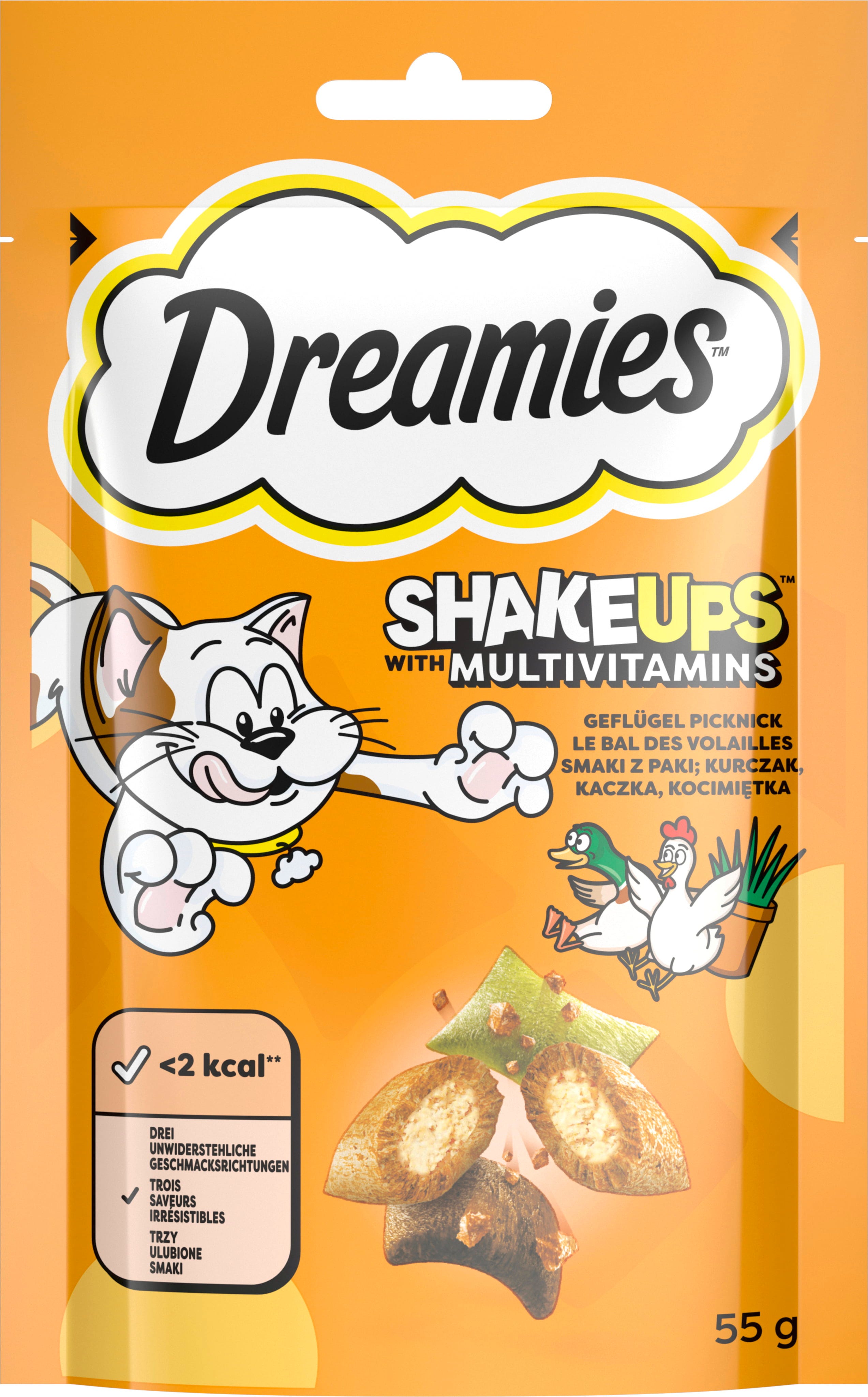 Chrumkavým vankúšikom Shake Ups Multivitamins od značky Dreamies vaše mačky určite neodolajú. Zvonku sú chrumkavé, vnútri krémové a obohatené o množstvo vitamínov. Tieto pochúťky majú príchuť kuraťa, kačice a kocúrnika.
