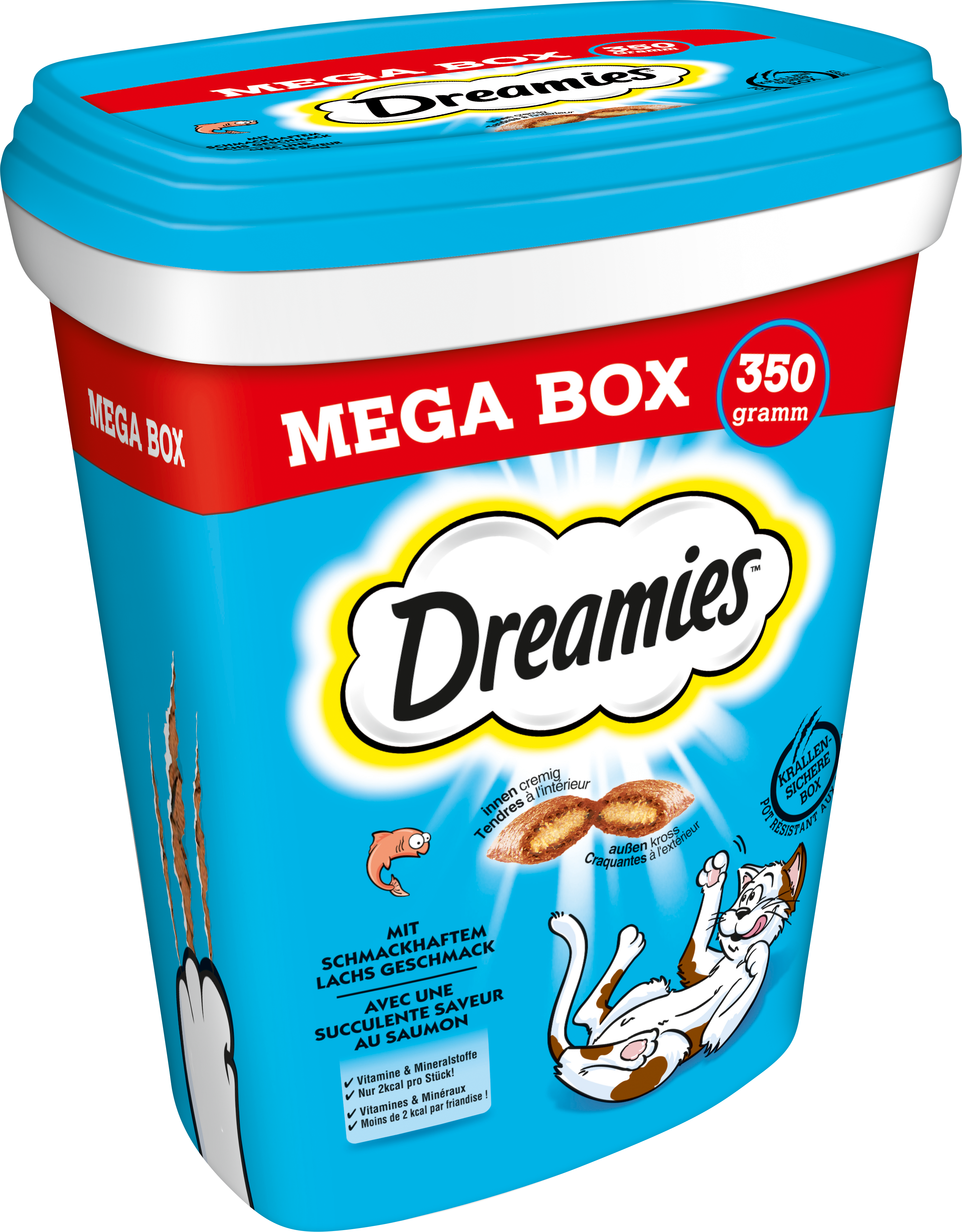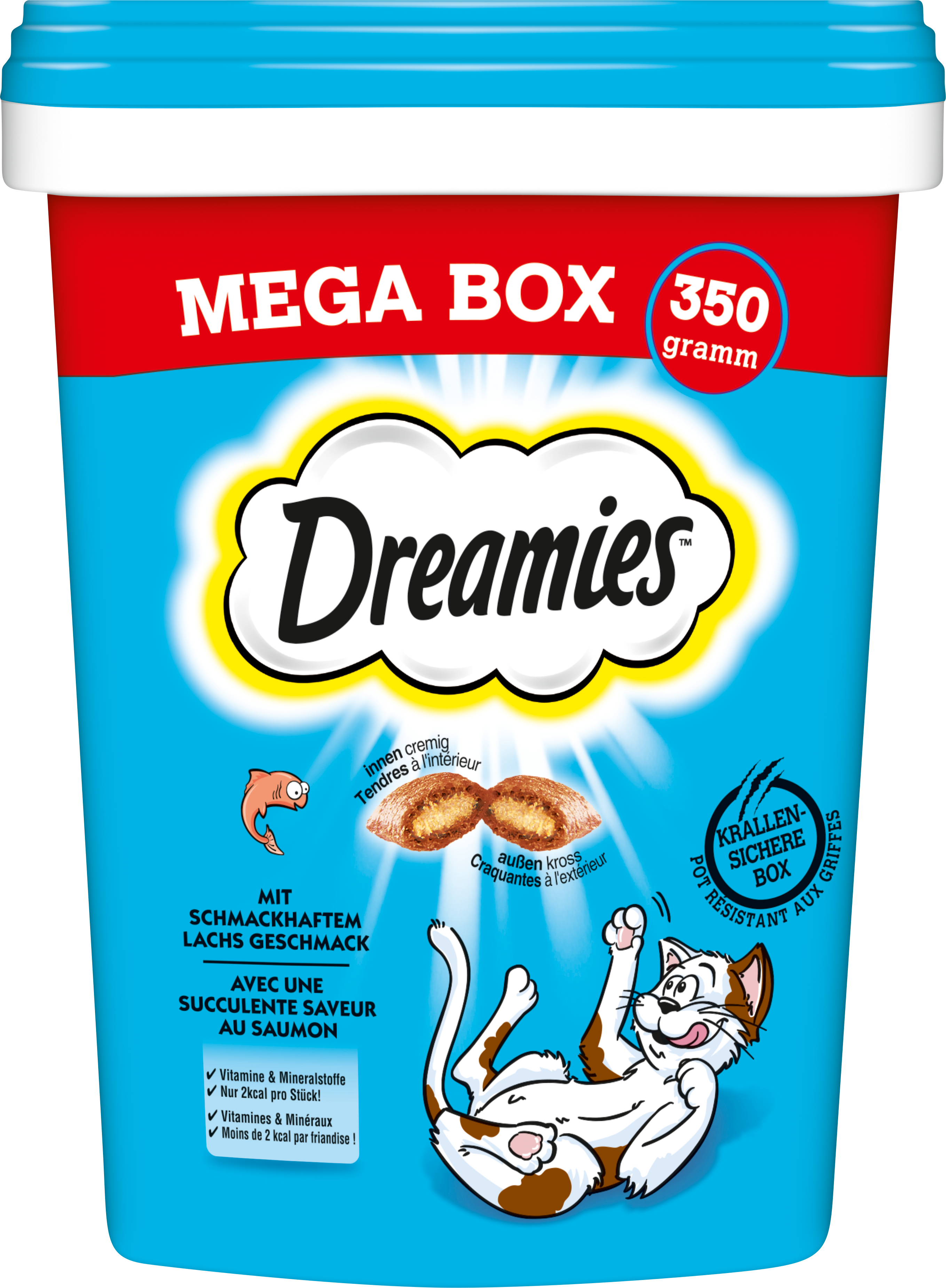 Prečo nevyskúšať tieto lahodné pochúťky Dreamies? Nielenže sú zvonku mimoriadne chrumkavé a vnútri lahodne krémové, ale obsahujú aj toho najkvalitnejšieho lososa.