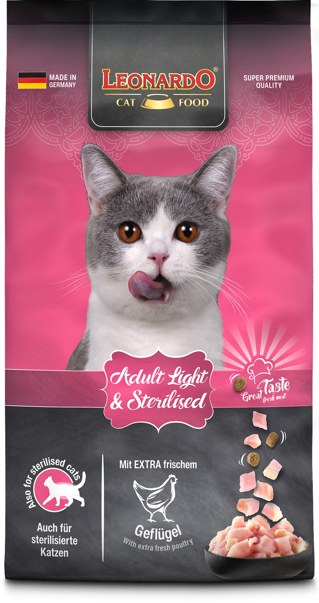 Suché krmivo Adult Light & Sterilised je krmivo so zníženým obsahom energie a vysokým obsahom bielkovín, ktoré kombinuje chutné hydinové mäso s cenným krillom a chia semienkami.