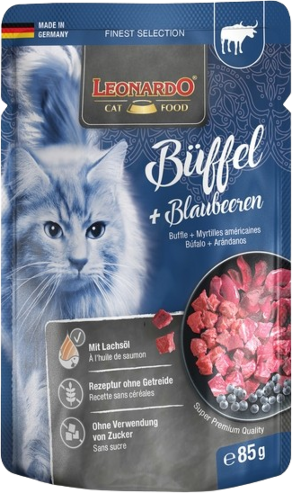 Šťavnaté mäso a chutné vnútornosti z byvolieho, kuracieho a hovädzieho mäsa s čučoriedkami premenia každé krmivo na skutočný kulinársky zážitok! Starostlivo vybrané ingrediencie s hodnotným lososovým olejom sú pripravené v porciovaných kapsičkách.