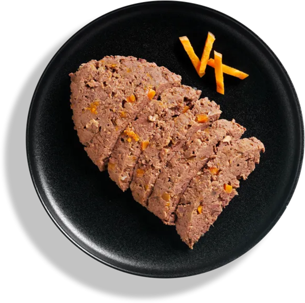 36,5 % Teľacie srdce/pľúca/obličky, 30 % Hydinové mäso/srdce/pečeň, 28,3 % Vývar z teľacieho a hydinového mäsa, 4 % Sušená mrkva, 0,5 % Sušené vaječné škrupiny, 0,5 % Minerálne látky, 0,2 % Olej z lososa