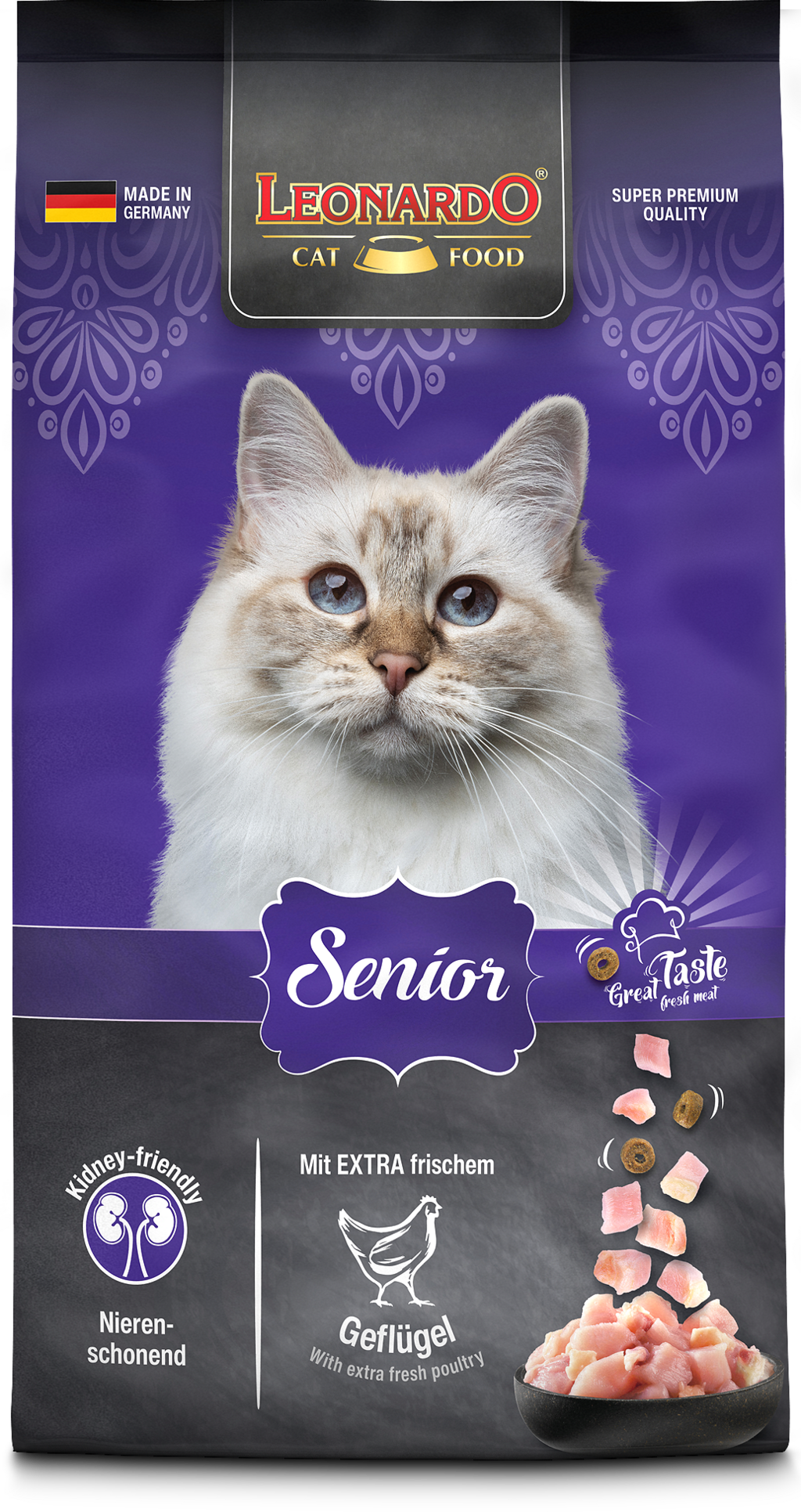 Toto suché krmivo pre seniorov je určené pre mačky od 10 rokov. Chutné granule obsahujú hydinové mäso a sú obohatené o krill, chia semienka a múčku z hroznových jadierok lisovaných za studena.