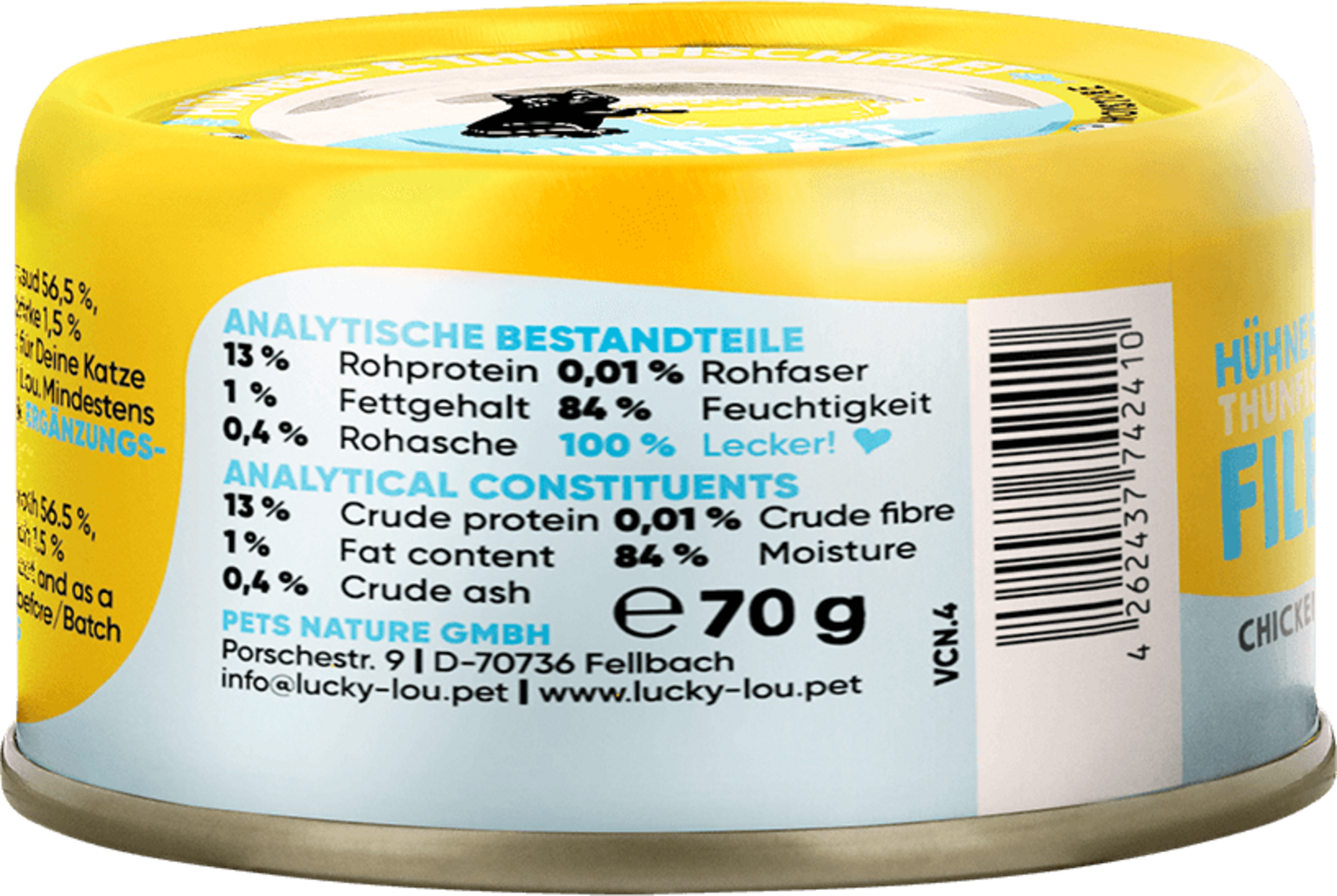 56,5 % Vývar (Kura, Tuniak), 38 % Kuracie filety, 4 % Filet z tuniaka, 1,5 % Tapiokový škrob