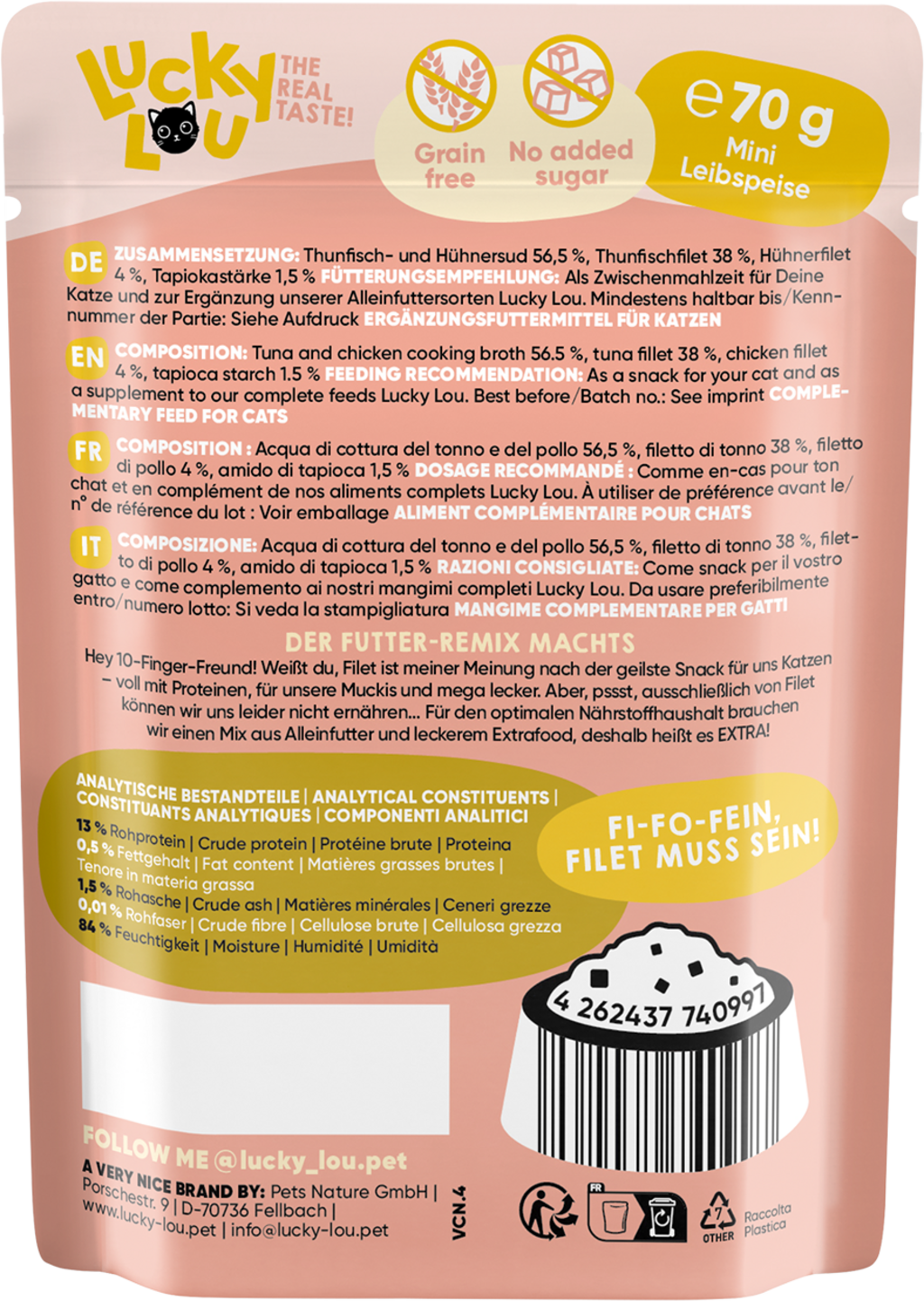 56,5 % Vývar (Tuniak, Kura), 38 % Filet z tuniaka, 4 % Kuracie filety, 1,5 % Tapiokový škrob