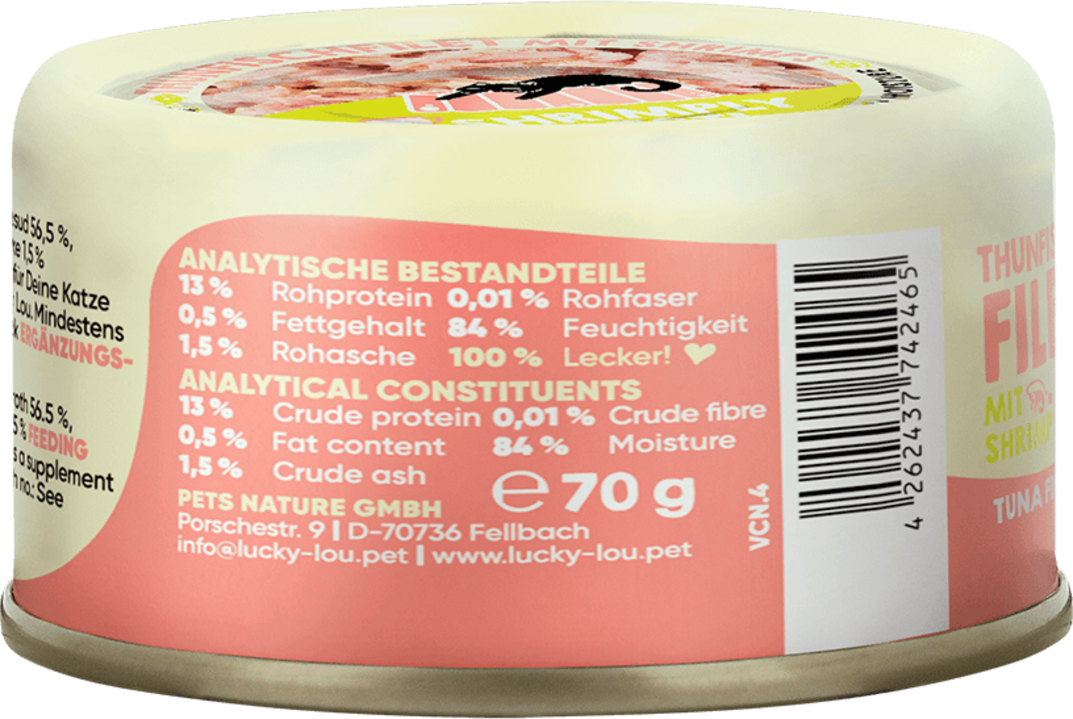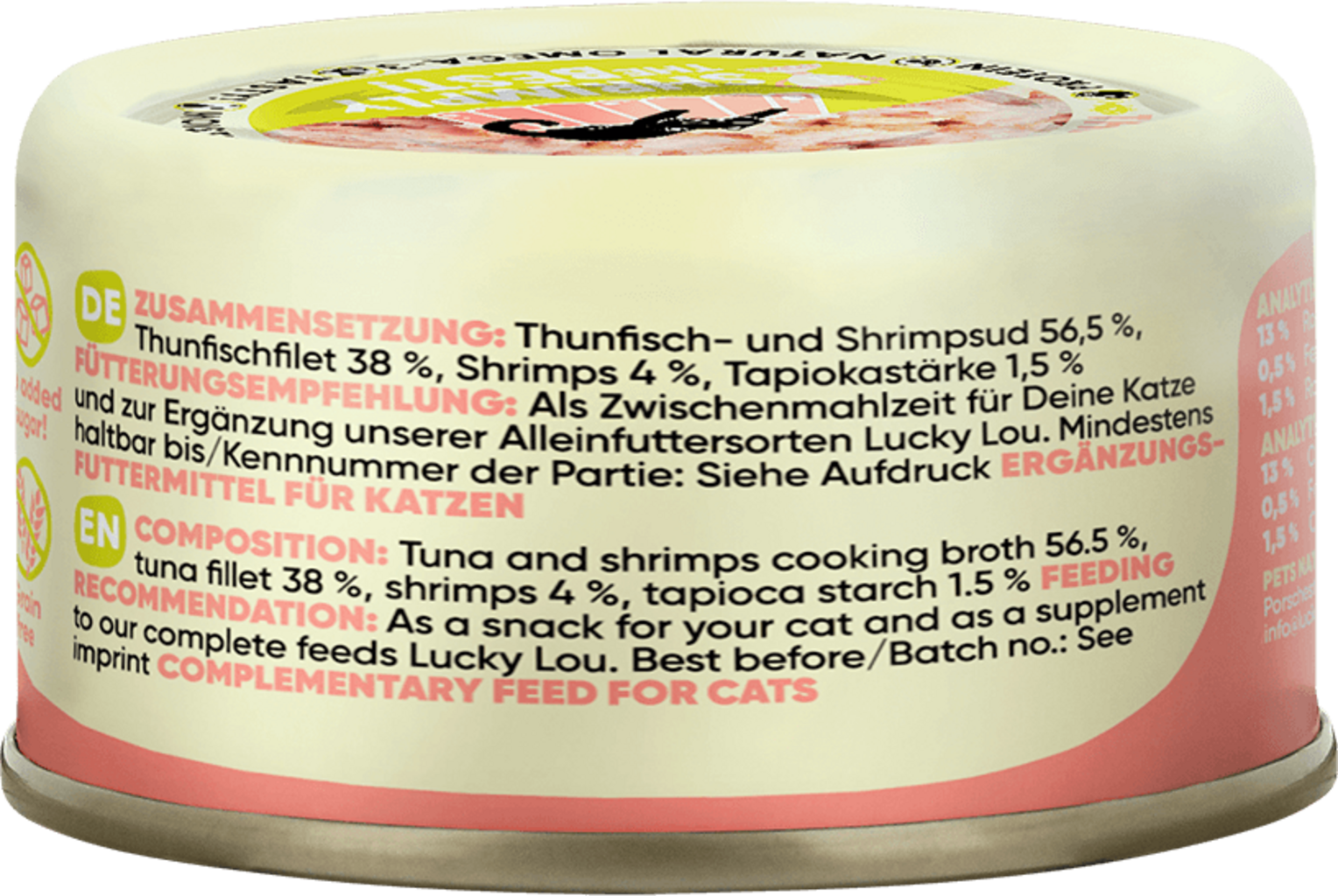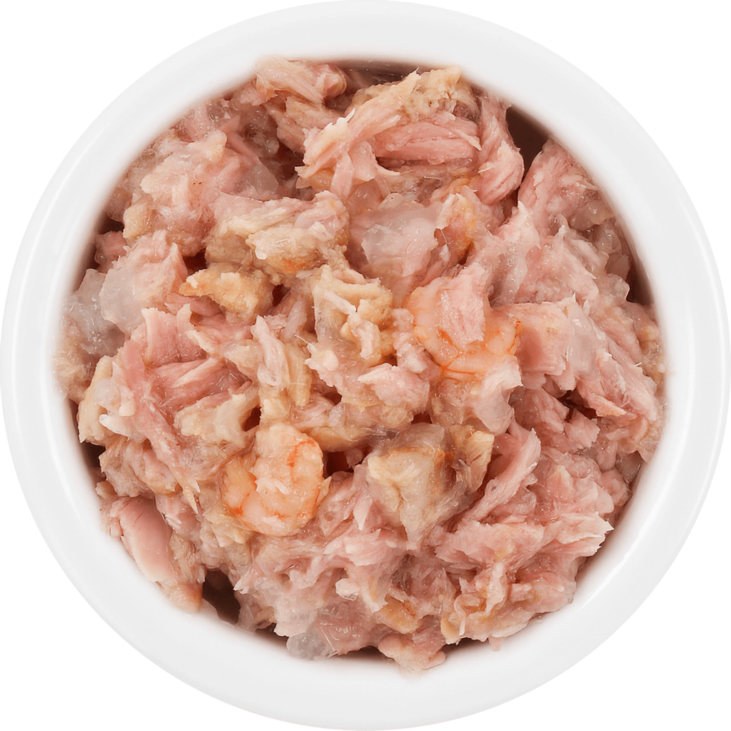 56,5 % Vývar (Tuniak, Krevety), 38 % Filet z tuniaka, 4 % Krevety, 1,5 % Tapiokový škrob