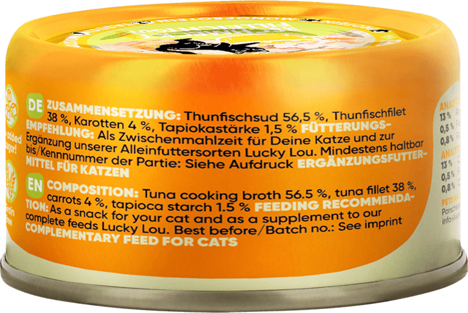 56,5 % Vývar z tuniaka, 38 % Filet z tuniaka, 4 % Mrkvy, 1,5 % Tapiokový škrob