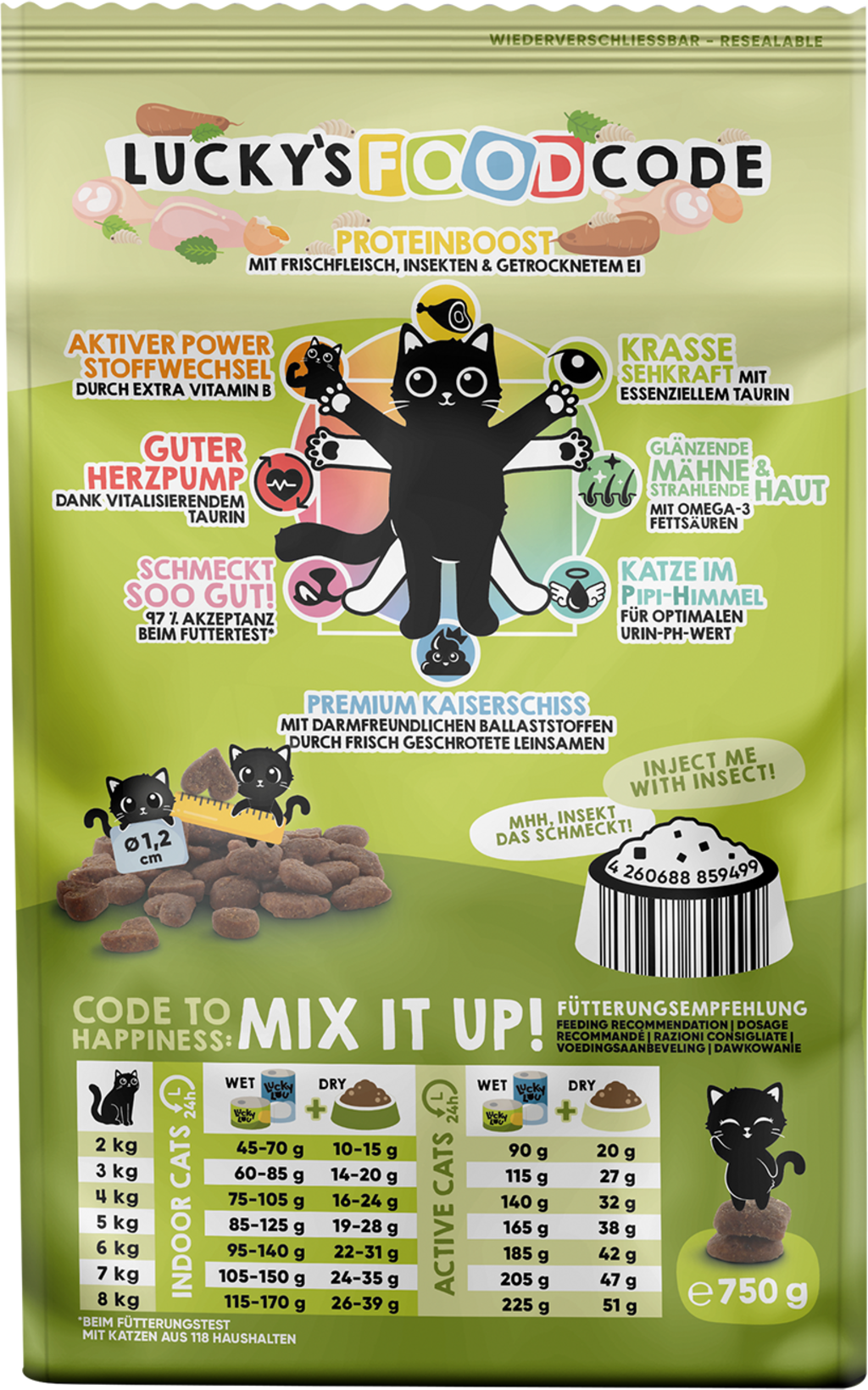 Lucky Lou Food Code sú špičkové granuly, pretože nielenže chutia neodolateľne chrumkavo a lahodne, ale vašu mačku zásobujú aj hodnotnými živinami primerane jej veku. Vyvážená receptúra tohto suchého krmiva, inšpirovaná dokonalými proporciami Vitruviánskeho muža od Leonarda da Vinciho, ponúka pre každý druh 8 benefitov, ktoré vašu mačku rozmaznajú holisticky od hlavy až po labky.