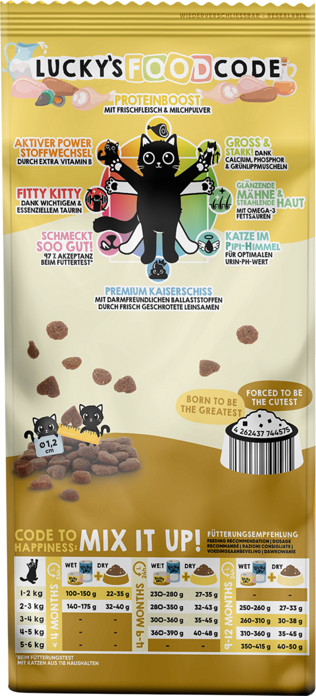 Lucky Lou Food Code sú špičkové granuly, pretože nielenže chutia neodolateľne chrumkavo a lahodne, ale vašu mačku zásobujú aj hodnotnými živinami už od začiatku. Vyvážená receptúra tohto suchého krmiva, inšpirovaná dokonalými proporciami Vitruviánskeho muža od Leonarda da Vinciho, ponúka pre každý druh 8 benefitov, ktoré vašu mačku rozmaznajú holisticky od hlavy až po labky.