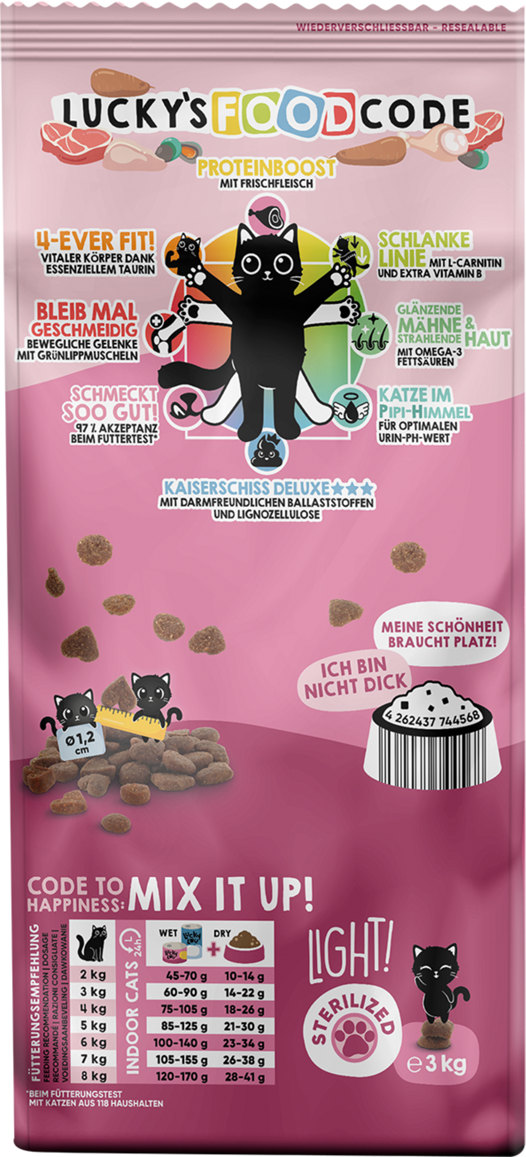 Lucky Lou Food Code sú špičkové granuly, pretože nielenže chutia neodolateľne chrumkavo a lahodne, ale vašu mačku zásobujú aj hodnotnými živinami primerane jej veku. Vyvážená receptúra tohto suchého krmiva, inšpirovaná dokonalými proporciami Vitruviánskeho muža od Leonarda da Vinciho, ponúka pre každý druh 8 benefitov, ktoré vašu mačku rozmaznajú holisticky od hlavy až po labky.