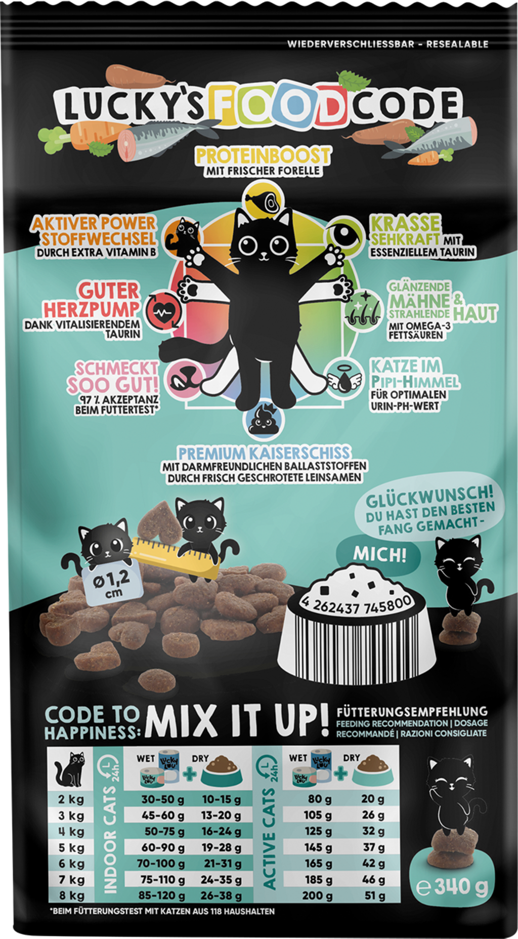 Lucky Lou Food Code je špičkové suché krmivo, pretože nielenže chutí neodolateľne chrumkavo a lahodne, ale vašu mačku zásobuje aj cennými živinami primerane jej veku. Vyvážená receptúra tohto suchého krmiva, inšpirovaná dokonalými proporciami Vitruviánskeho muža od Leonarda da Vinciho, ponúka pre každý druh 8 benefitov, ktoré vašu mačku rozmaznávajú holisticky od hlavy až po labky.