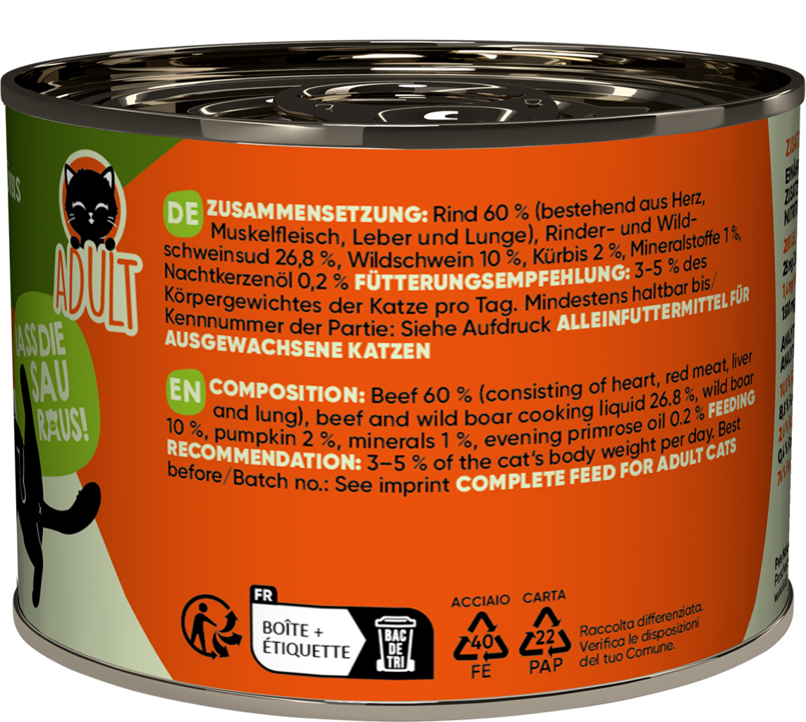 60 % Hovädzie mäso (Srdce, Svalovina, Pečeň, Pľúca), 26,8 % Vývar z hovädzieho a diviačieho mäsa, 10 % Diviak, 2 % Tekvica, 1 % Minerálne látky, 0,2 % Pupalkový olej