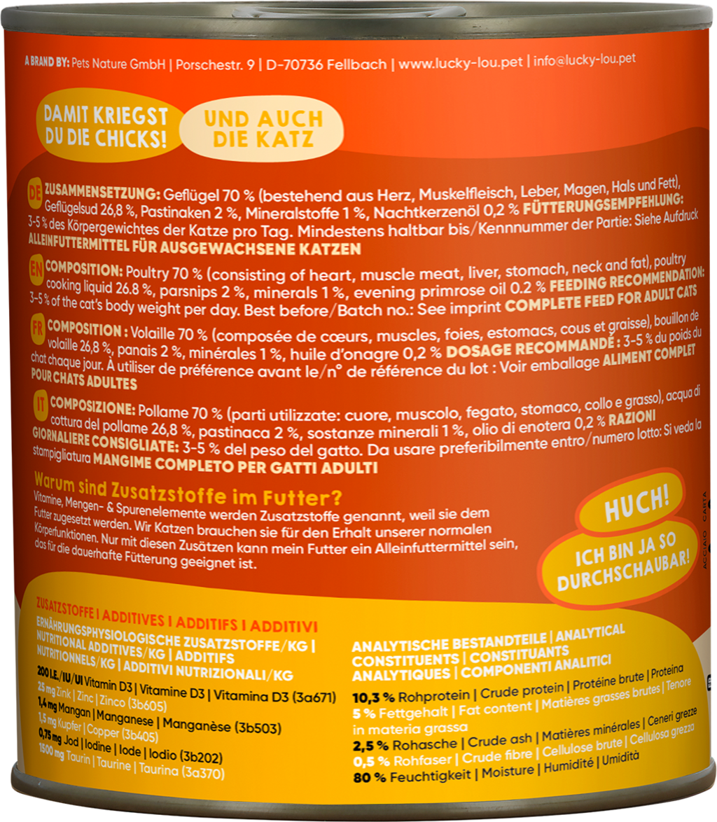 70 % Hydina (Srdce, Svalovina, Pečeň, Žalúdok, Krk, Tuk), 26,8 % Hydinový vývar, 2 % Pastinák, 1 % Minerálne látky, 0,2 % Pupalkový olej