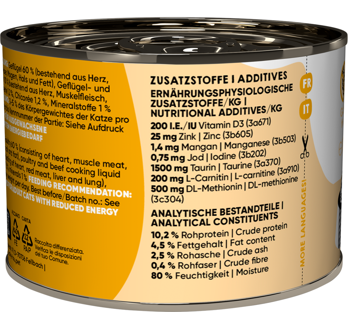 60 % Hydina (Srdce, Svalovina, Pečeň, Žalúdok, Krk, Tuk), 26,6 % Vývar z hydiny a hovädzieho, 10 % Hovädzie mäso (Srdce, Svalovina, Pečeň, Pľúca), 1,2 % Zeler, 1,2 % Čakanka, 1 % Minerálne látky