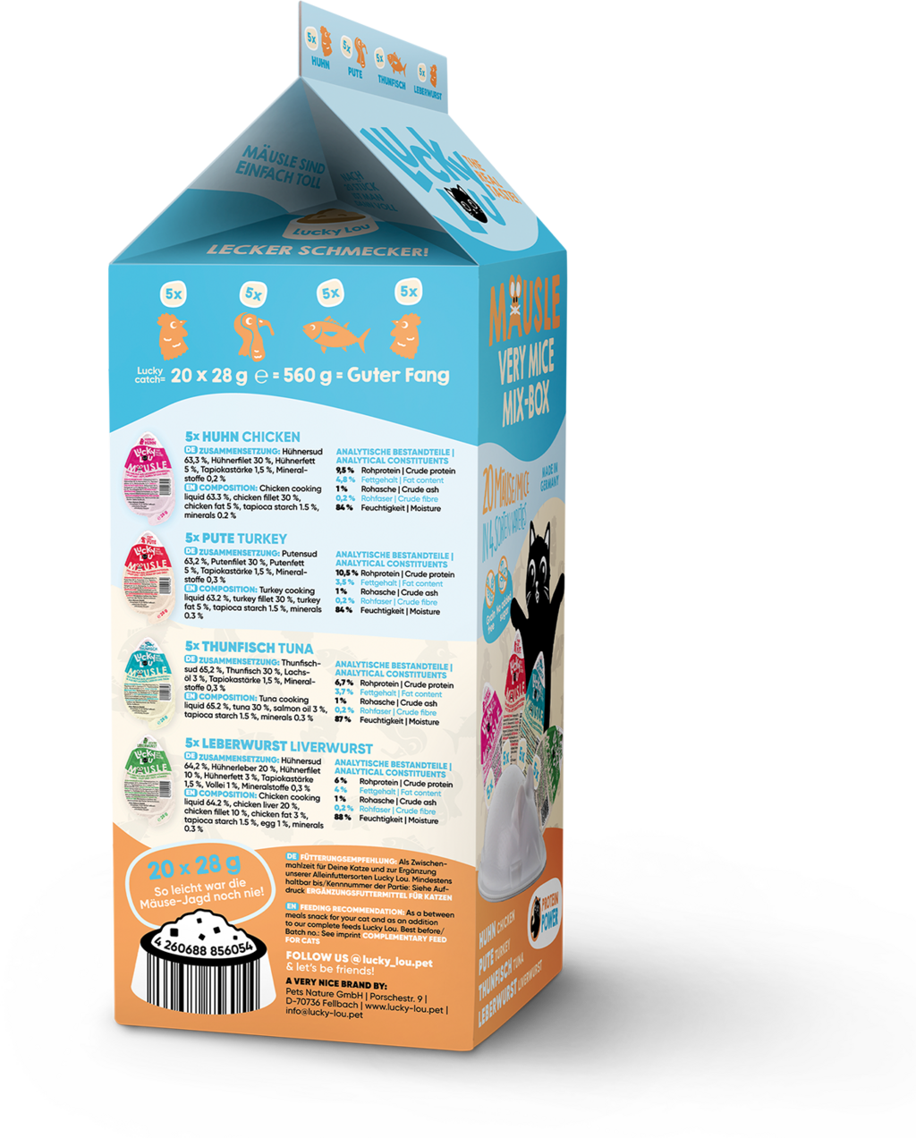 • Mäusle podávajte ako doplnok ku kompletnému krmivu od Lucky Lou alebo ako snack kedykoľvek počas dňa.