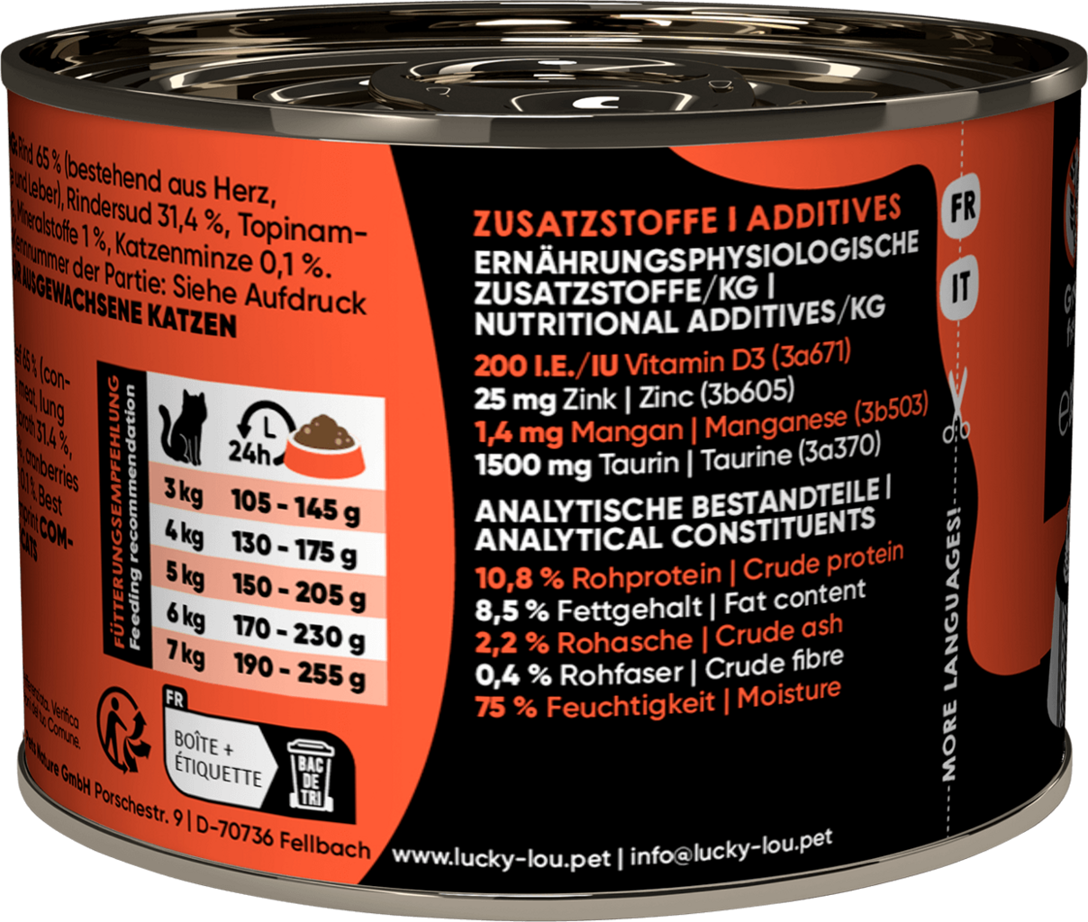 65 % Hovädzie mäso (Srdce, Svalovina, Pľúca, Pečeň), 31,4 % Hovädzí vývar, 1,5 % Topinambur, 1 % Brusnice, 1 % Minerálne látky, 0,1 % Kocúrnik