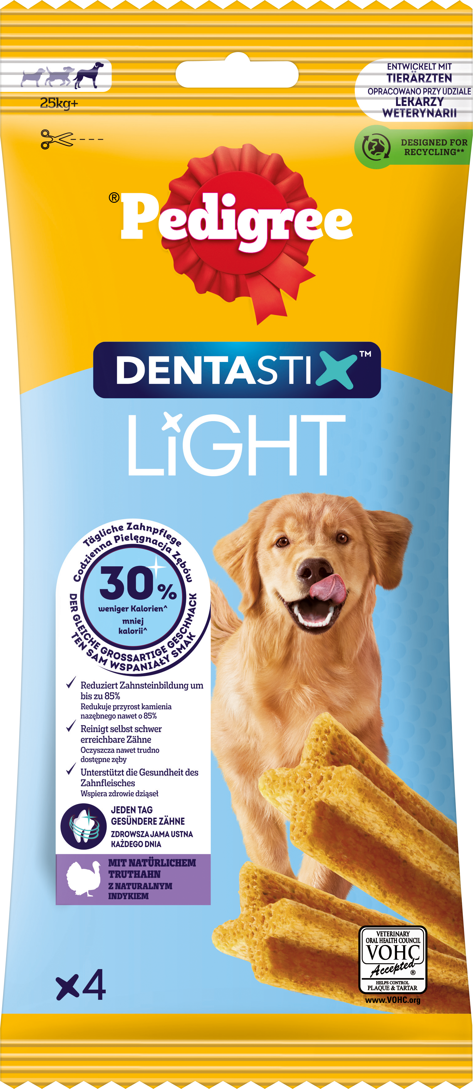PEDIGREE® DENTASTIX™ LIGHT Large pomáha čistiť zuby vášho psa a redukuje zubný povlak a kameň. S o 30 % menej kalórií na tyčinku sú ideálne pre každodennú starostlivosť o zuby. Vďaka lahodnej príchuti morčacieho mäsa sú obľúbenou pochúťkou psov.