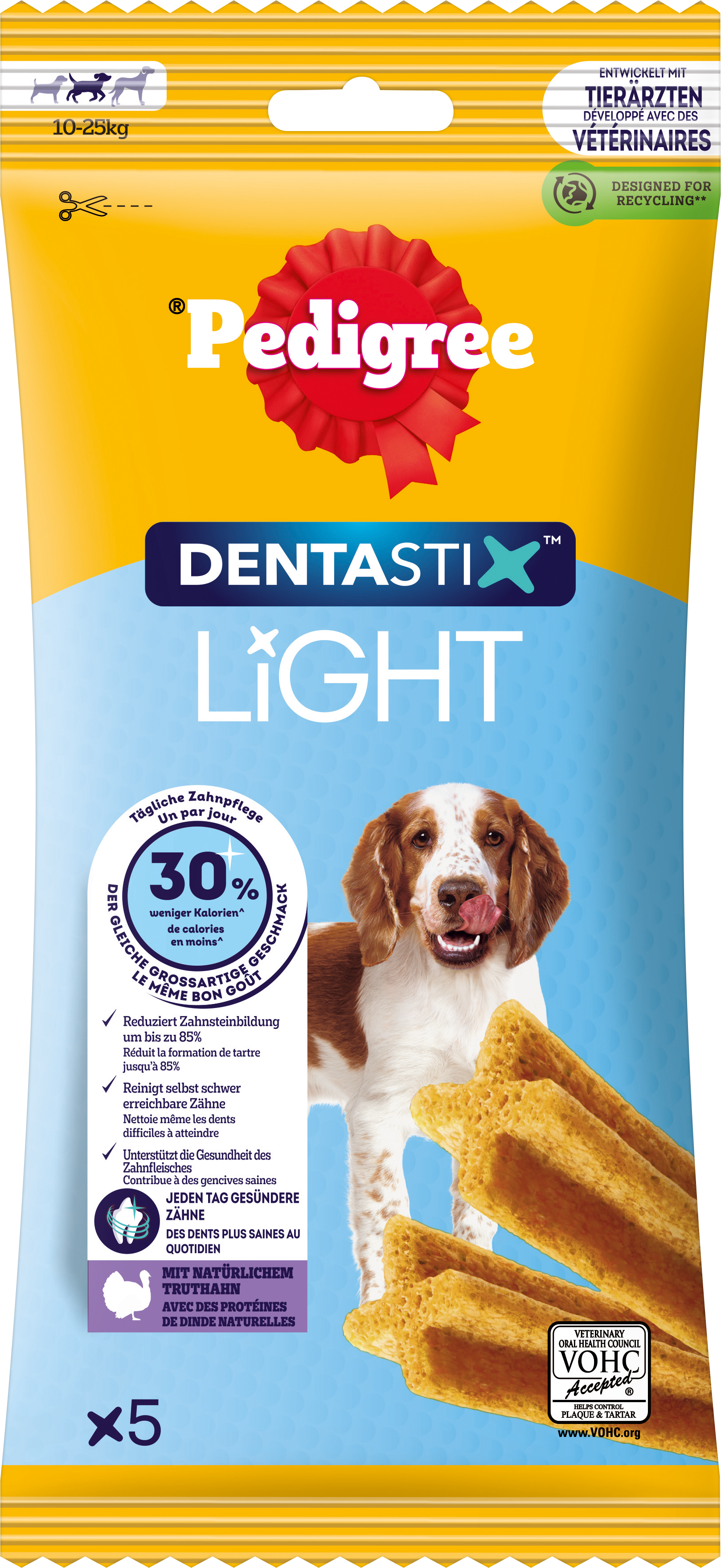 PEDIGREE® DENTASTIX™ LIGHT Medium pomáha čistiť zuby vášho psa a redukuje zubný povlak a kameň. S o 30 % menej kalórií na tyčinku sú ideálne na každodenné použitie. Vďaka lahodnej príchuti morčacieho mäsa sú obľúbenou pochúťkou psov.