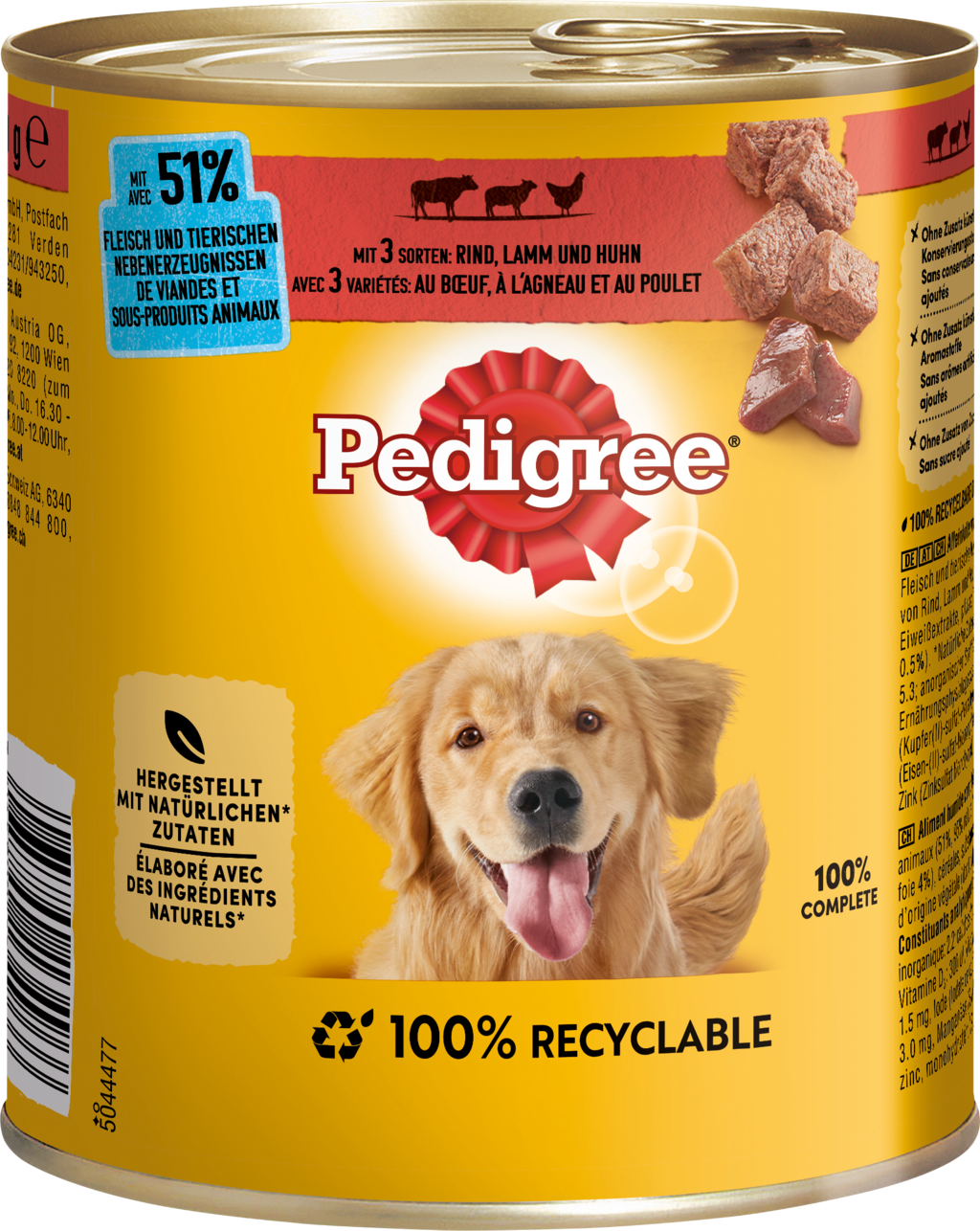 Paštéta od Pedigree je skutočným vrcholom mokrého krmiva, či už sa podáva samostatne alebo spolu so suchým krmivom. Obsahuje 3 chutné druhy mäsa - hovädzie, jahňacie a kuracie. Vylepšená receptúra obsahuje 51 % mäsa a vedľajších živočíšnych produktov a je prirodzene vyrobená bez umelých dochucovadiel, farbív, konzervačných látok a pridaného cukru. Kompletné krmivo pre psov, ktoré vášmu psovi dodá prírodnú vlákninu a dôležité vitamíny a minerály.